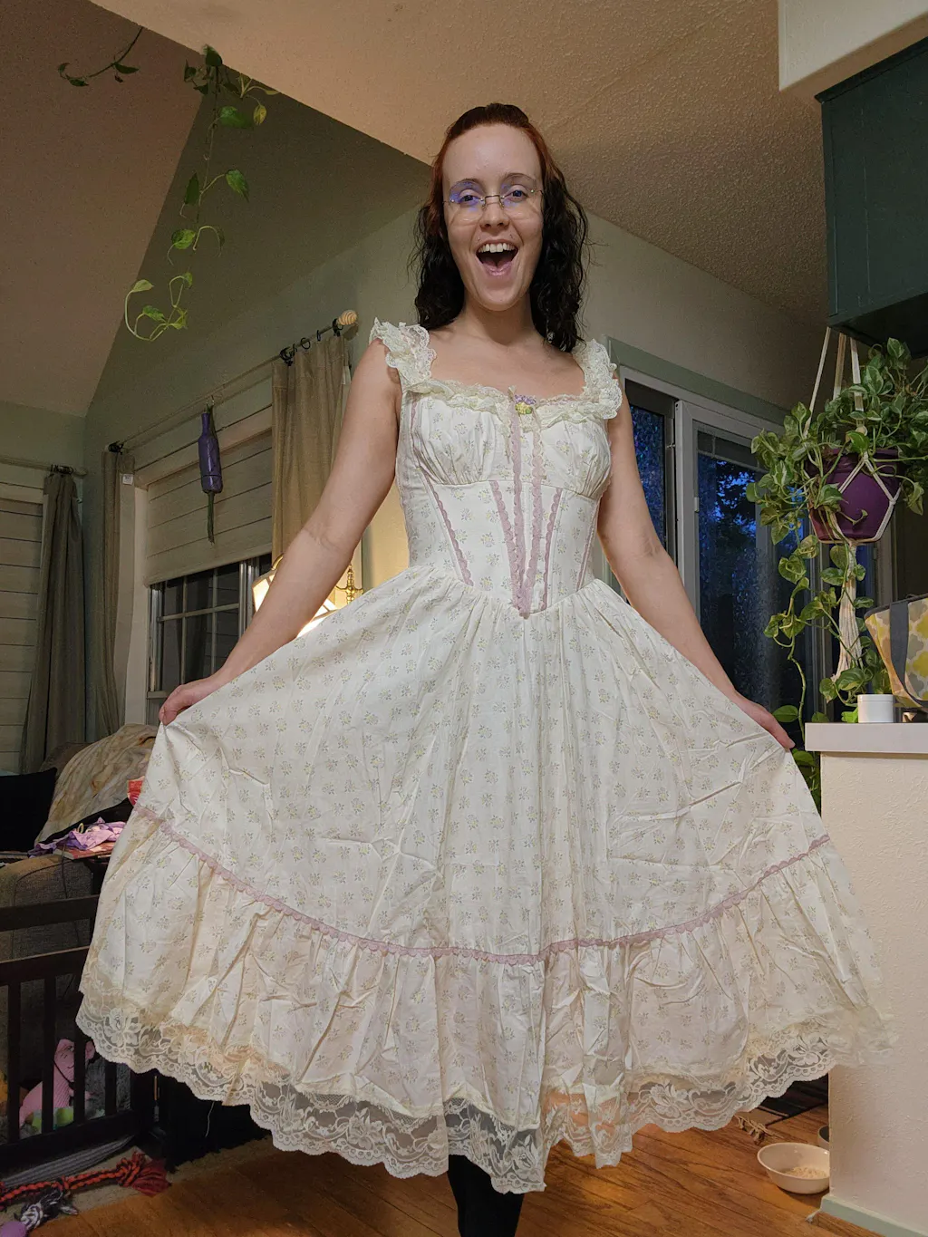 I adore that this dress is cotton it feels so comfortable! I really love the lace detailing on the boning and it fits so nicely. You can tighten it with the tie in the back. There is plenty of space for bust, tho this is not something of concern for me. The length is perfect and the colors are absolutely beautiful! Lavender is my most favorite color and I love all of the lavender little details! Actually looks nice wearing the straps off the shoulder as well. Highly recommend this dress and for me I sized up one from my regular lace-made sizing because I wanted it to fit a little bit looser knowing that I could tighten it on my own with the tie in the back. I really don't like clothing being too tight for my sensory needs!