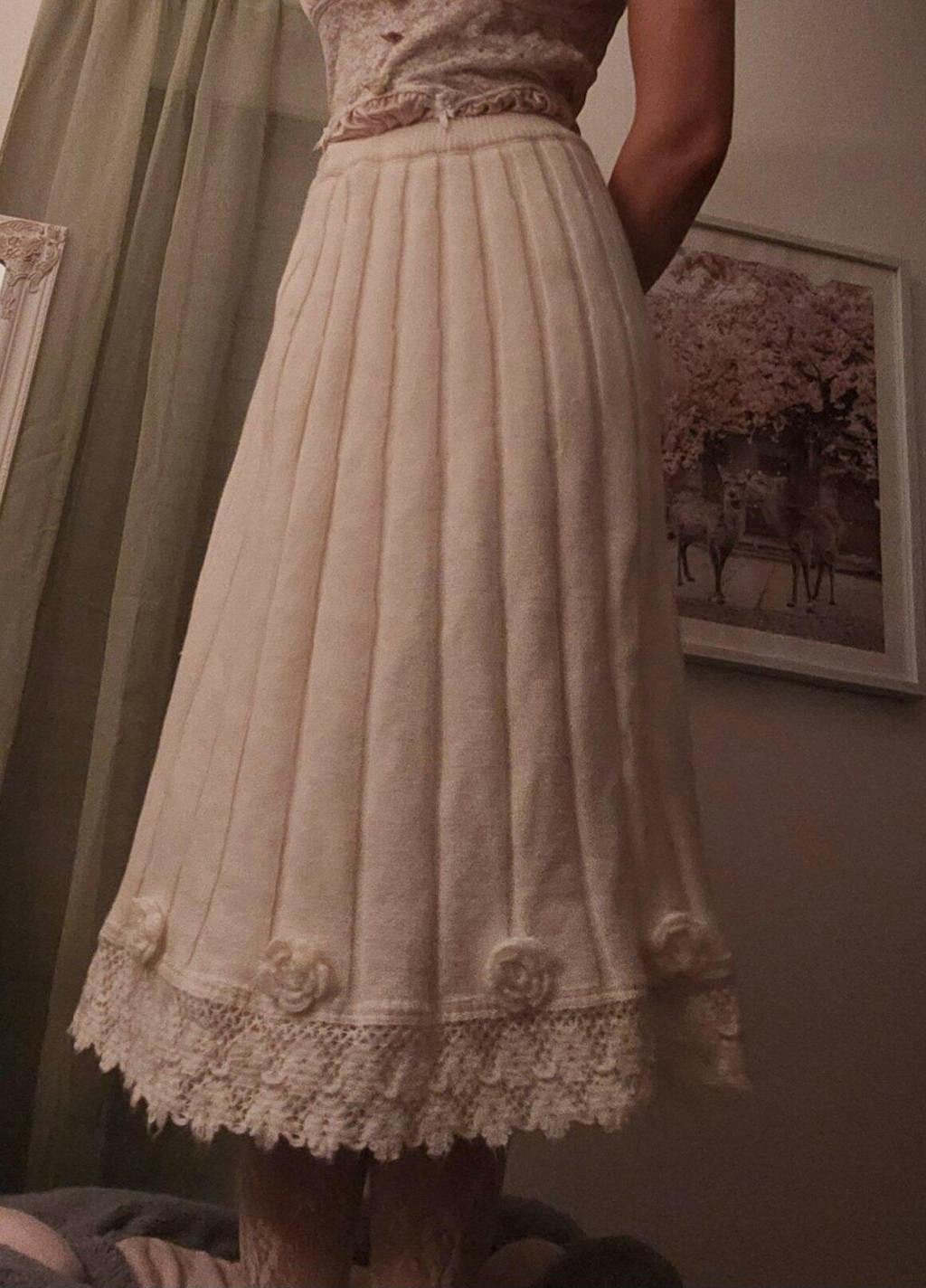 The skirt is absolutely beautiful. The white rose detail at the bottom makes it incredibly delicate and elegant. The fabric feels like a heavy knit, with a lovely drape, and it pairs effortlessly with any outfit. The only downside is that the elastic waistband can sometimes fold over, which is why I gave it four stars. ⭐⭐⭐⭐