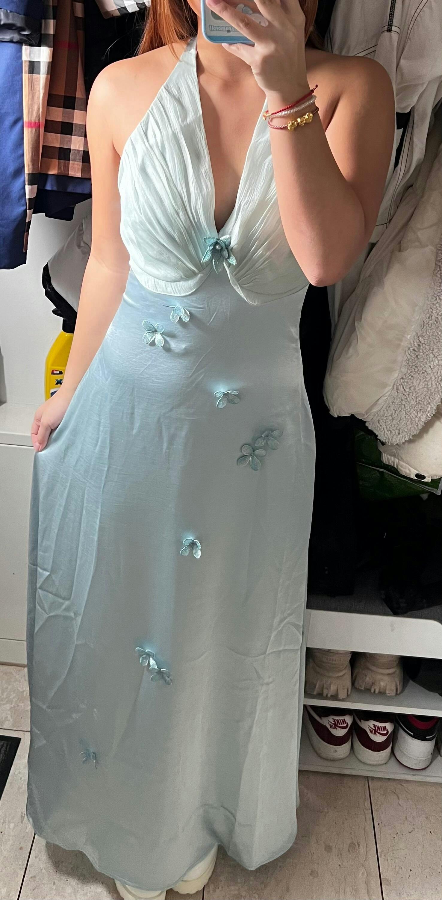 super cute dress. well made and the fabric is heavy and drapes perfectly. the flowers were a little crumply which looked cheap but i’m sure it can be straightened out