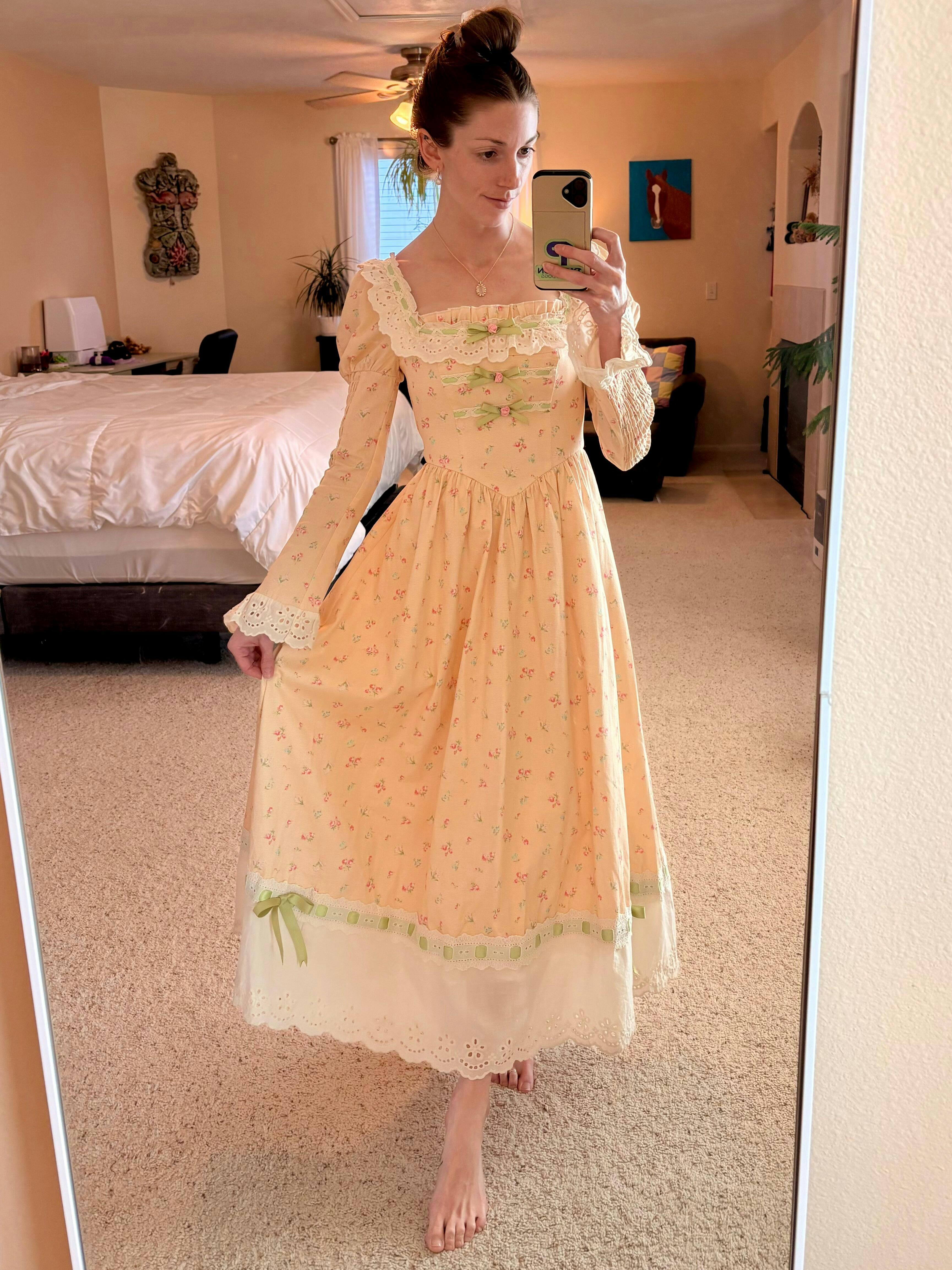 I’m wearing XS for a perfect fit and I’m 100lbs, 5’3 tall, 33” bust, 23” waist, 33” hip. The tie back lets you cinch the waist perfectly. I cannot get over how beautiful the yellow and green is in person, and the detailing of the bows and lace. I almost didn’t get this one and it turned out to be maybe my favorite!