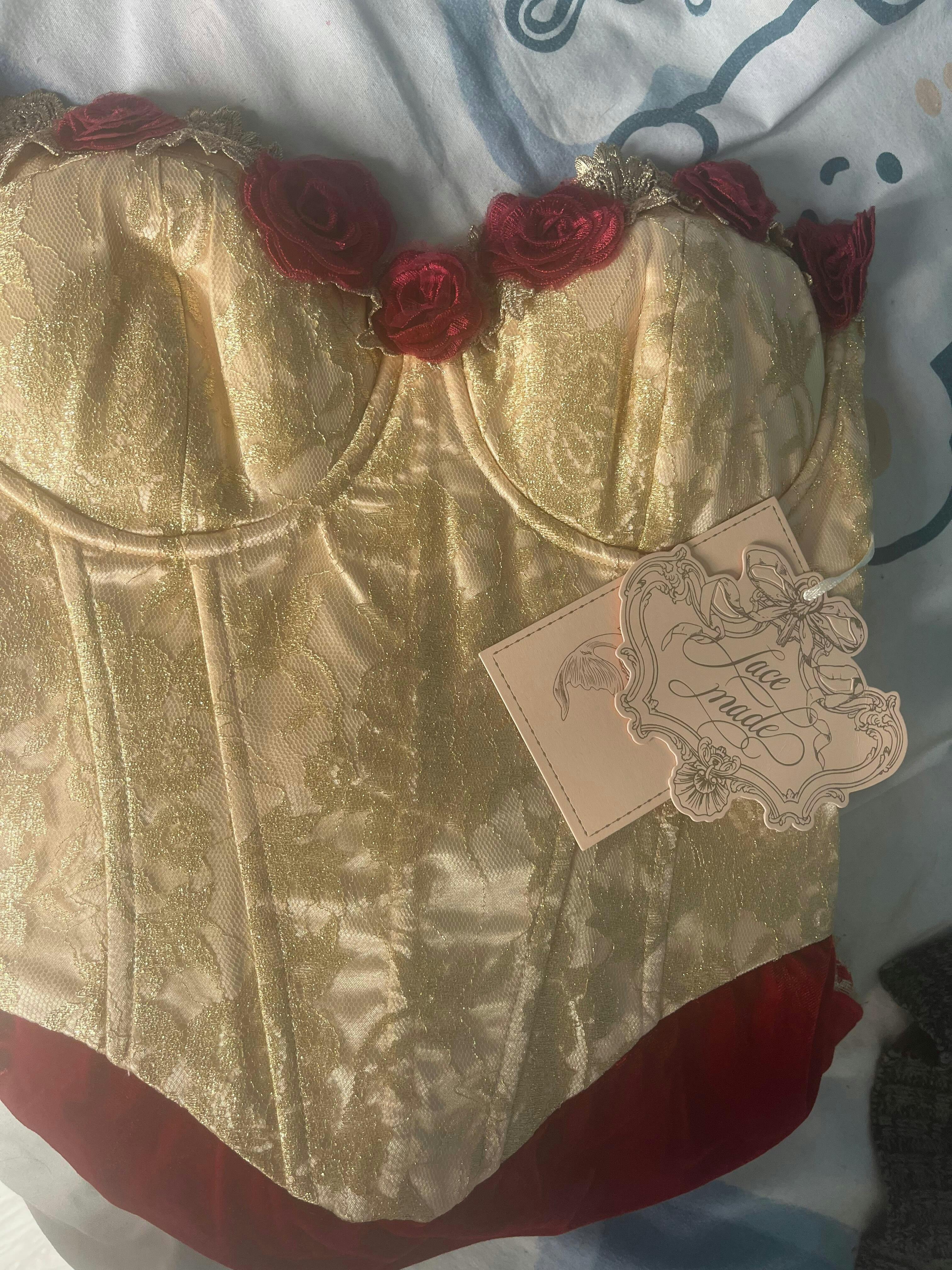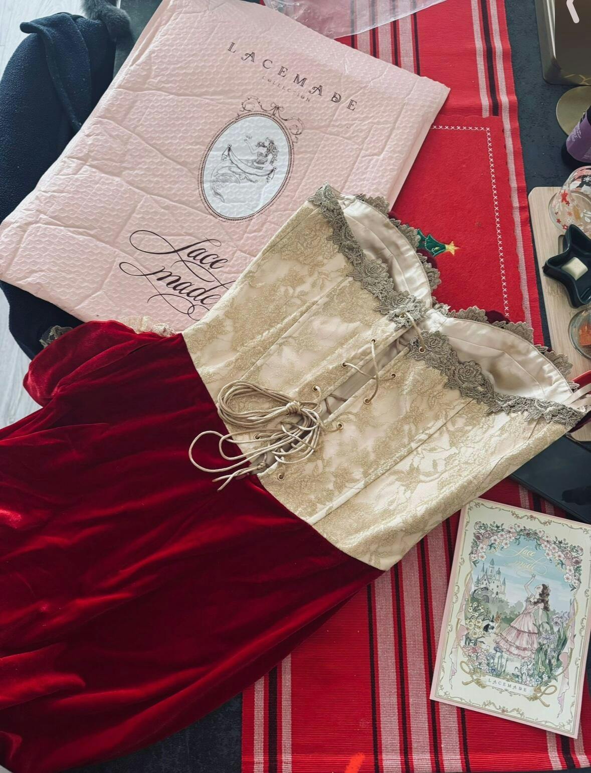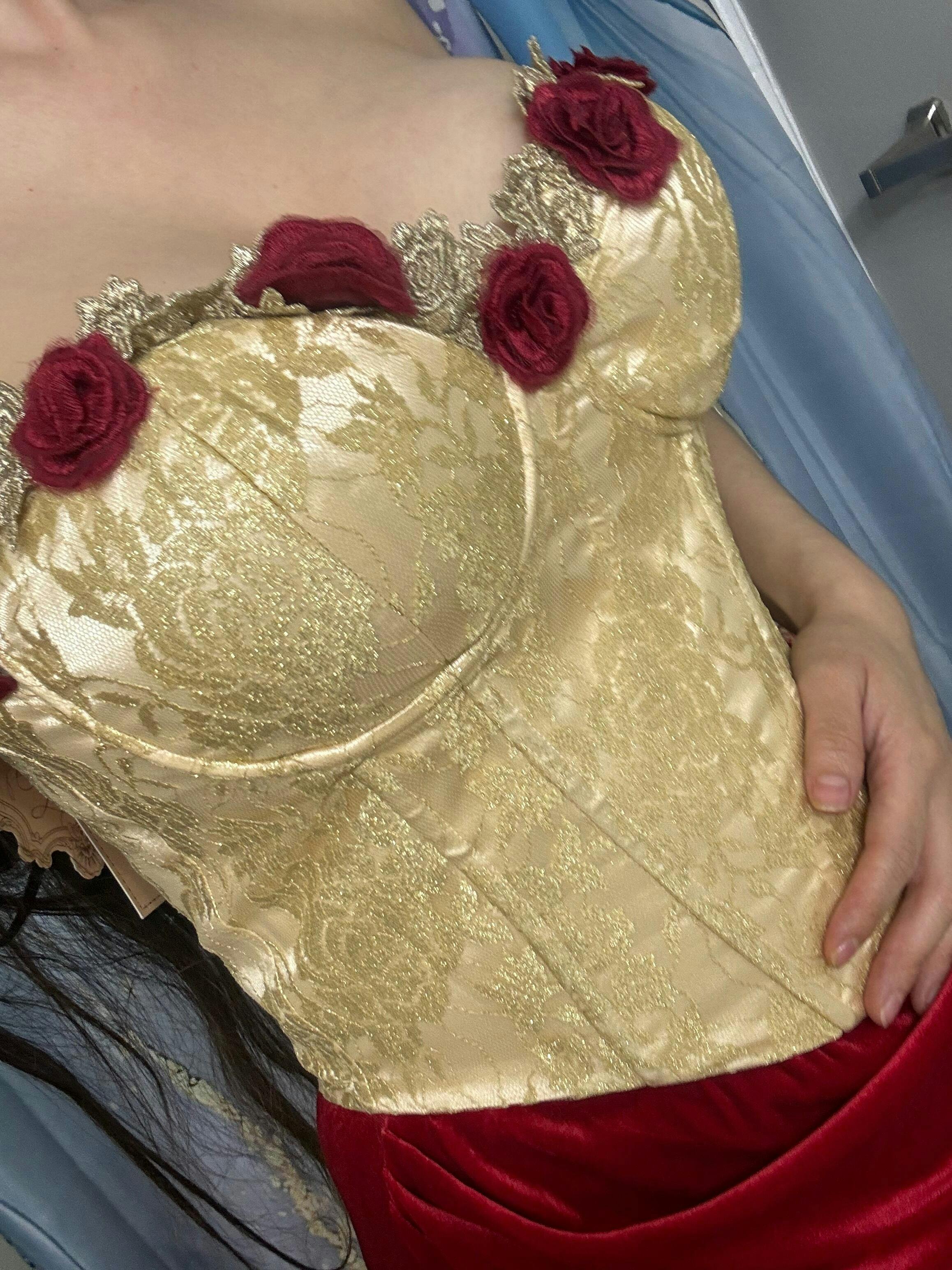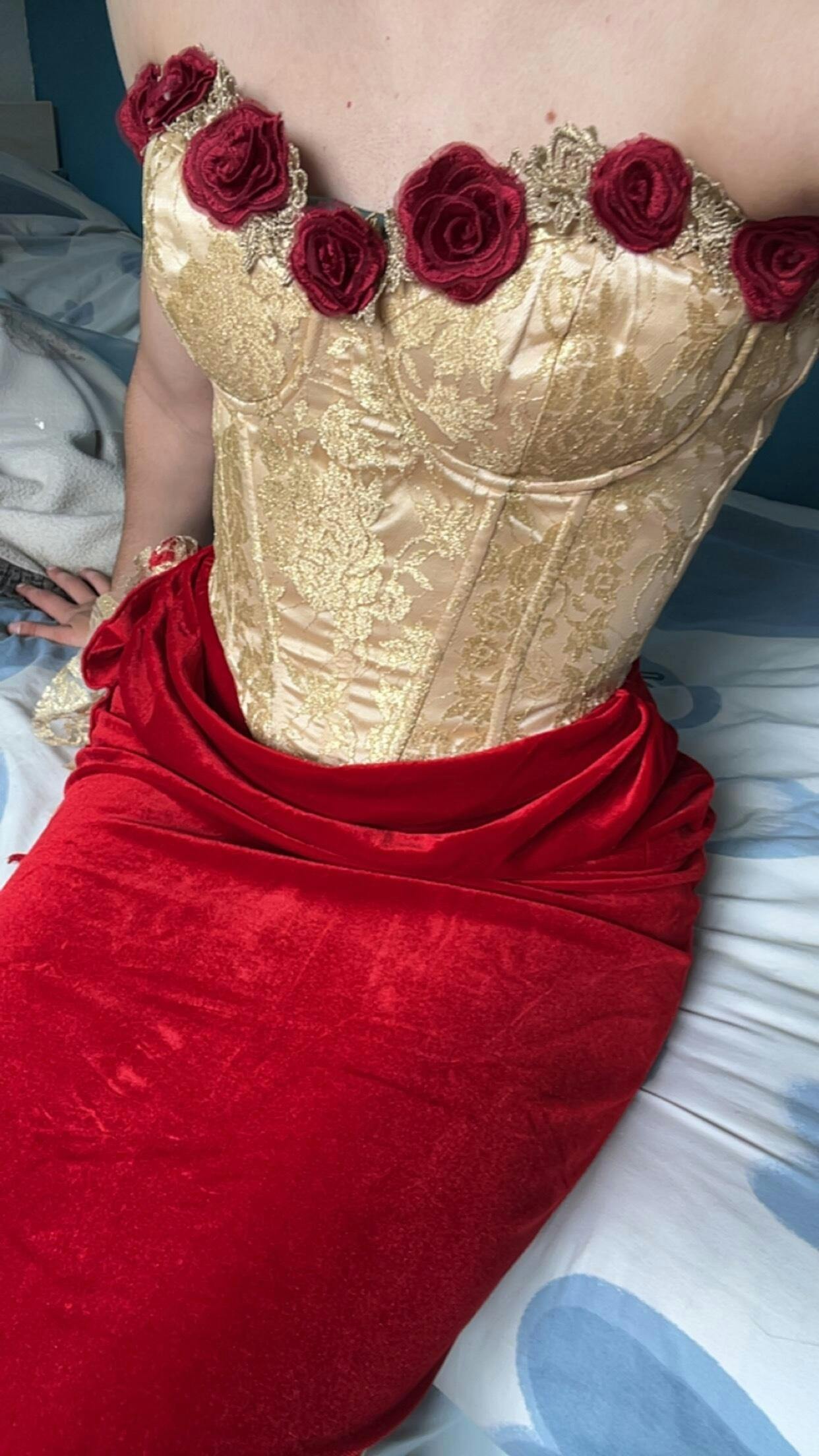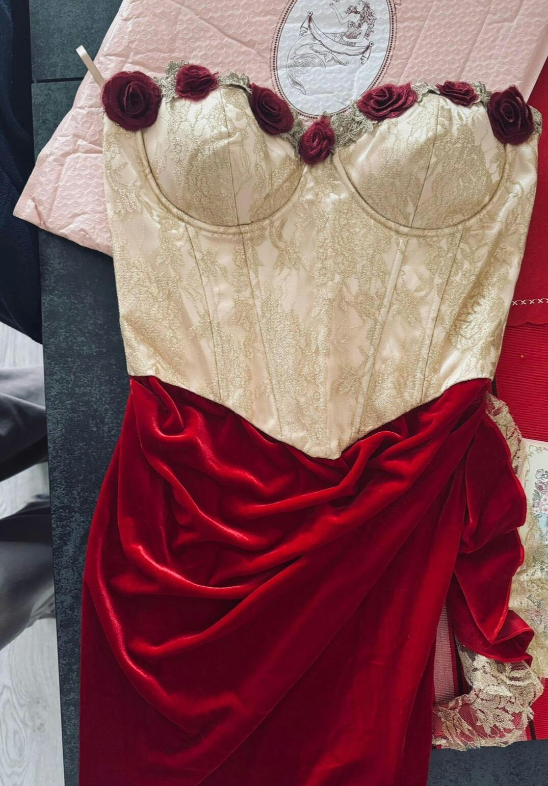 This dress is an absolute masterpiece! The golden lace corset with delicate rose details feels both romantic and regal, while the rich red velvet drape adds a dramatic, luxurious touch. The fit is flattering and the lace-up back gives it a perfect, customizable silhouette. It’s elegant, feminine, and truly unique — a fairytale dress that makes you feel like royalty.