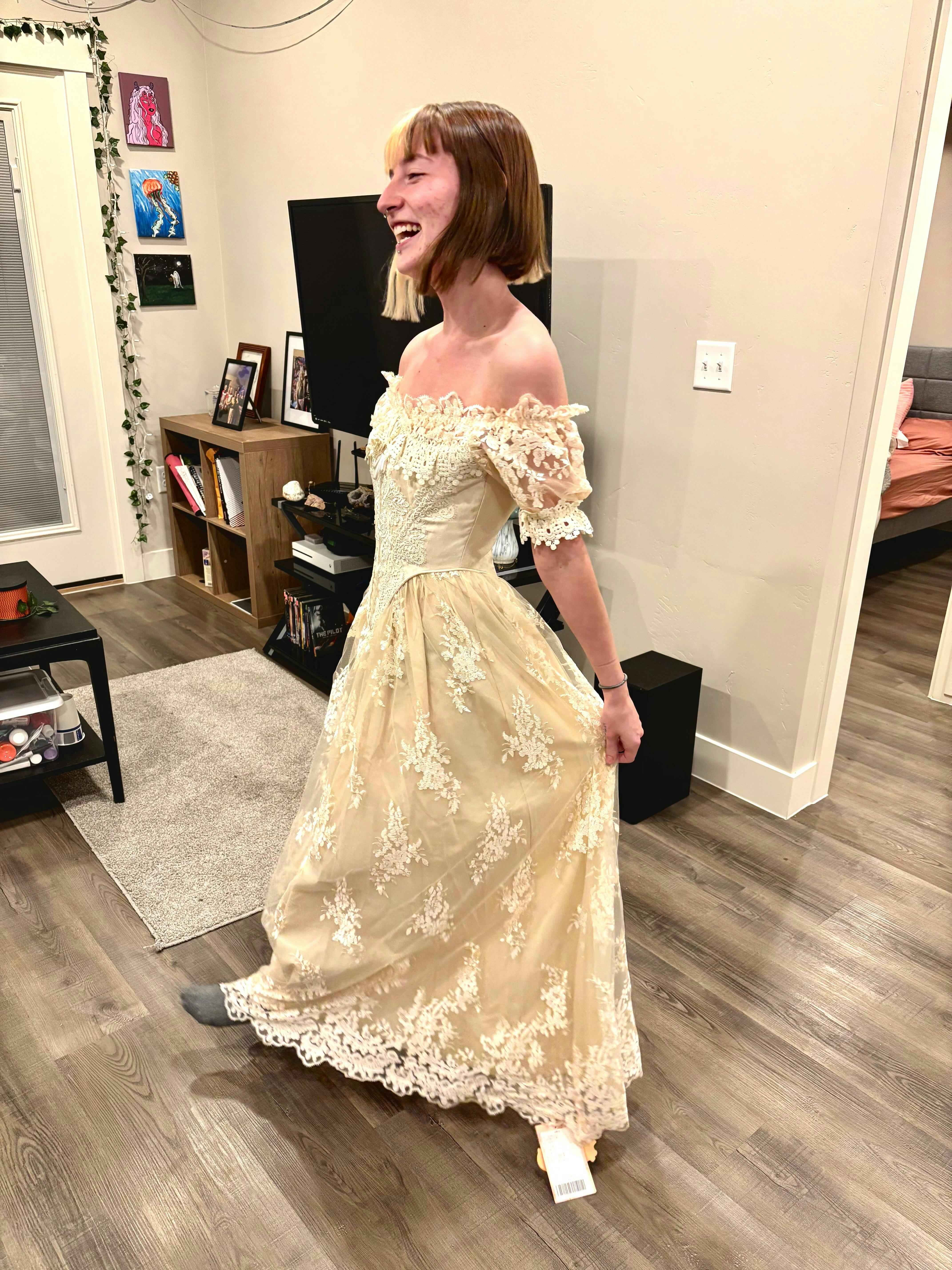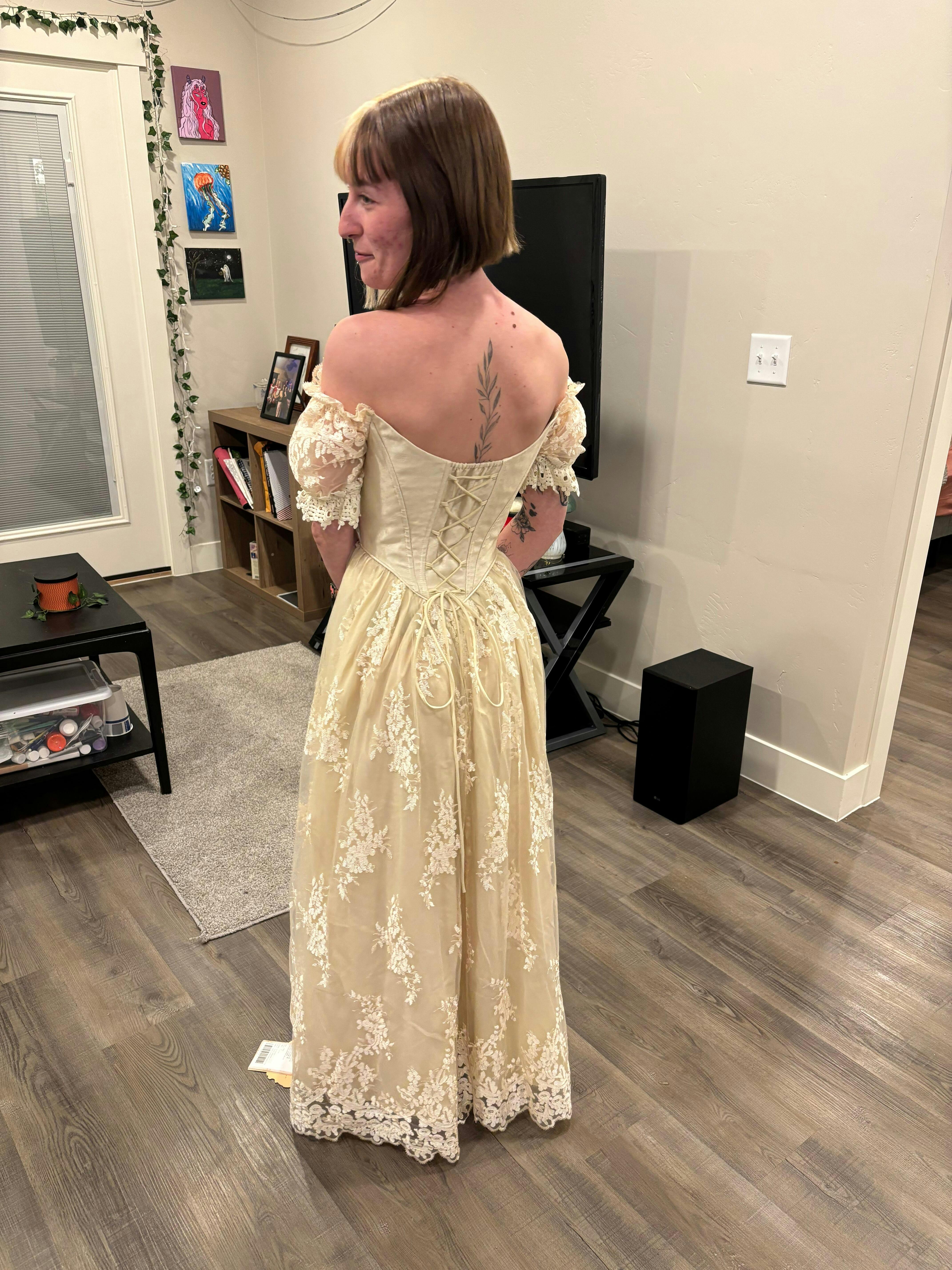 The dress got delivered pretty quick like a week later and the whole attire was like a romantic dream!!! It definitely gives Christine Daee wedding dress from the phantom of the Opera 2004 film. The material is comfortable and thank goodness it fits, I got a 2x and really glad I sized up. I'm usually a size 18 in us. Thank you lacemade for creating such wonderful fairytale creations. Wished local clothes stores have such wonderful designs in stock.