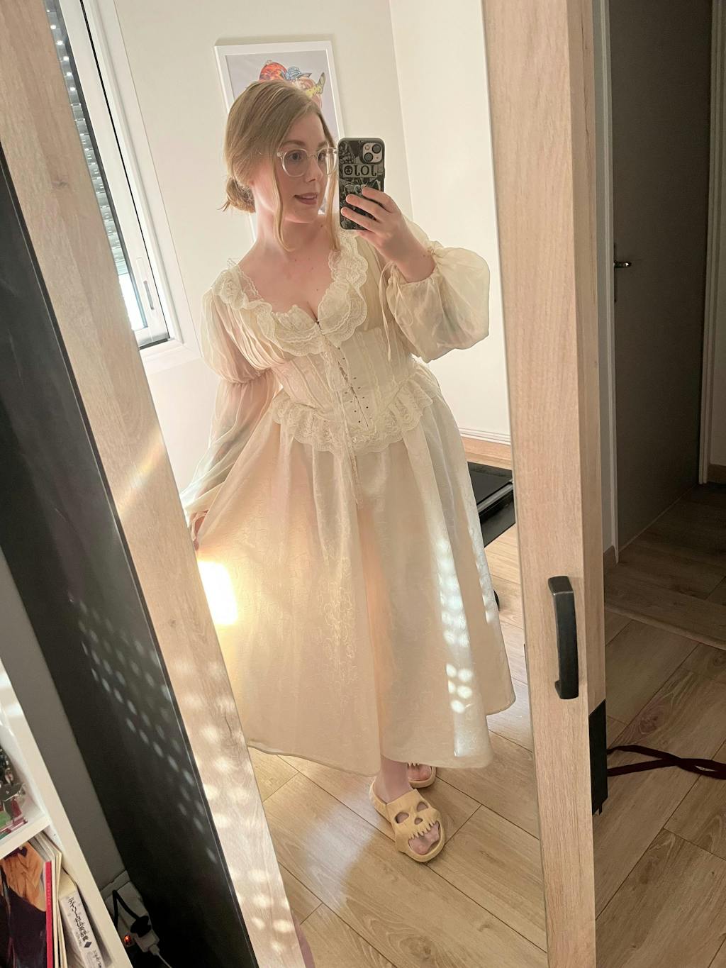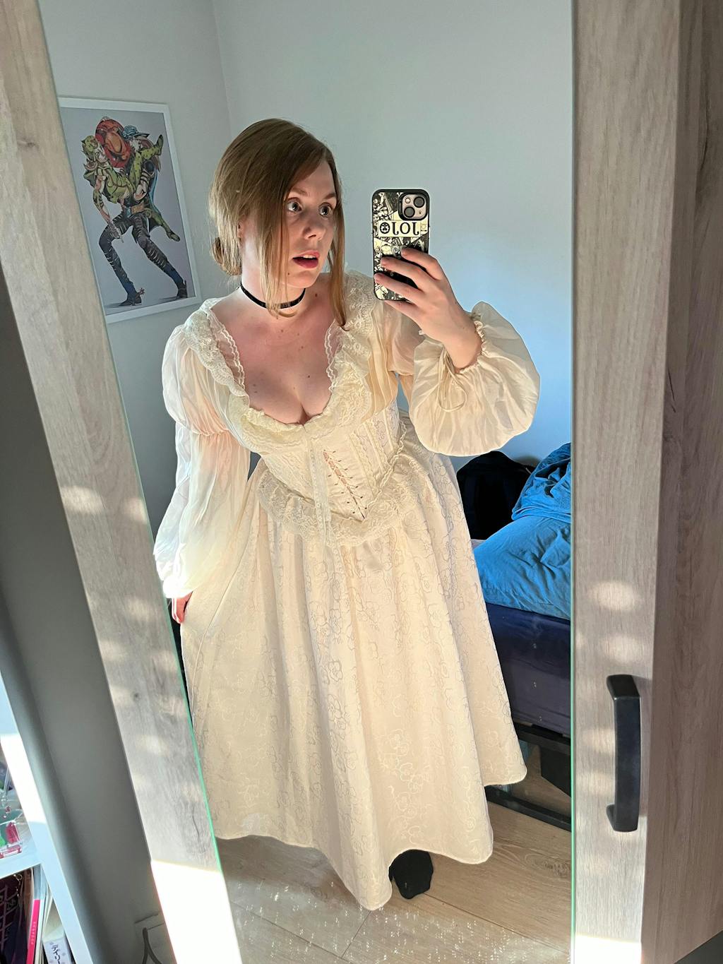 Ok, I ordered size XL, and honestly it was too small for me. But it's my fault. my waist size is 88cm, but I didn't see their plus size range and should've bought their plus size 1XL instead of this one. But I love the detailing and it's truly beautiful dress. My mom thinks it look indecent 😂 but my friends say it looks ok in today's day and age. I know it's not intended to look like this but still very pretty dress..