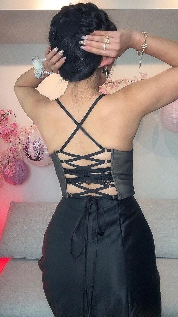 Very elegant dress with a beautiful back. One small drawback: I usually wear a size S, but the dress didn't fit the back; it was way too tight