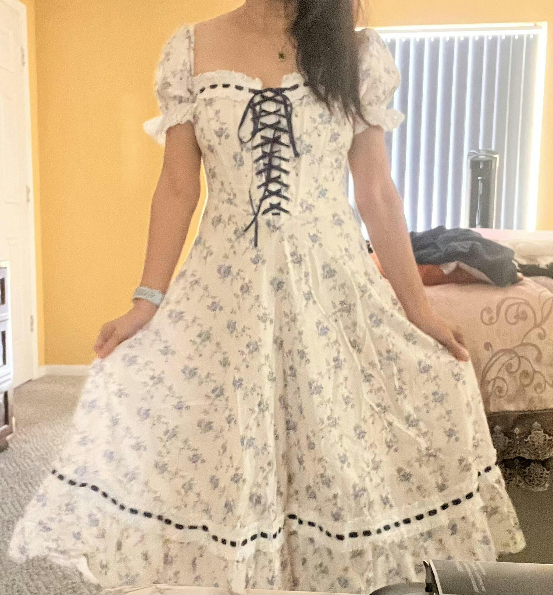I’m 5’2”, 113 lbs, and chose size M to be safe since LaceMade sizing tends to run small. Even though my waist measurement is slightly larger than the M size chart, this dress fits me well. The front corset uses non-stretch ribbons, but the laces are long enough to loosen or tighten comfortably, which really helps with fit.