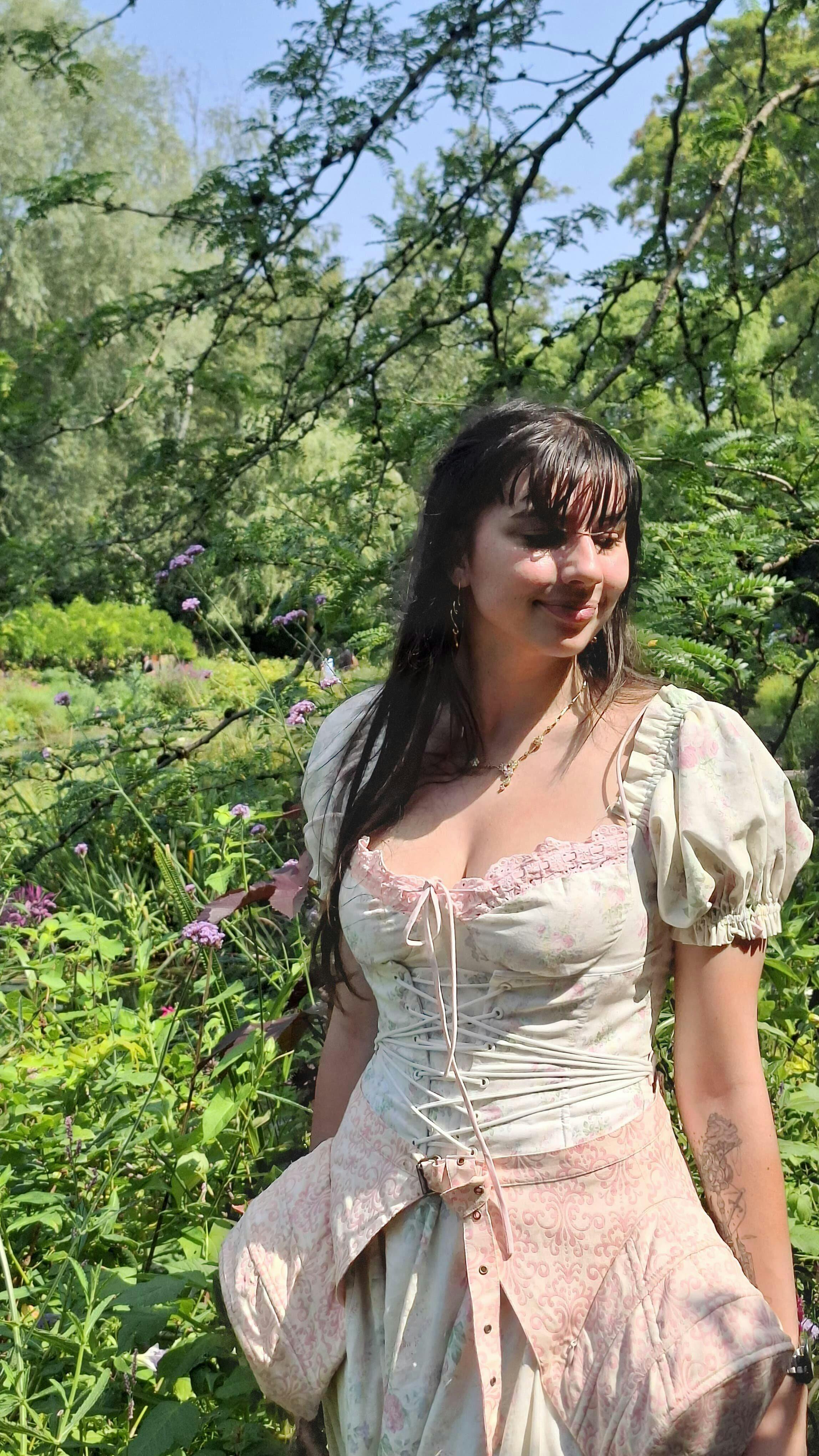 Usually wear a size M but got a L and it still fits beautifully. The corset is just perfection! And colors together are so much more beautiful in person!