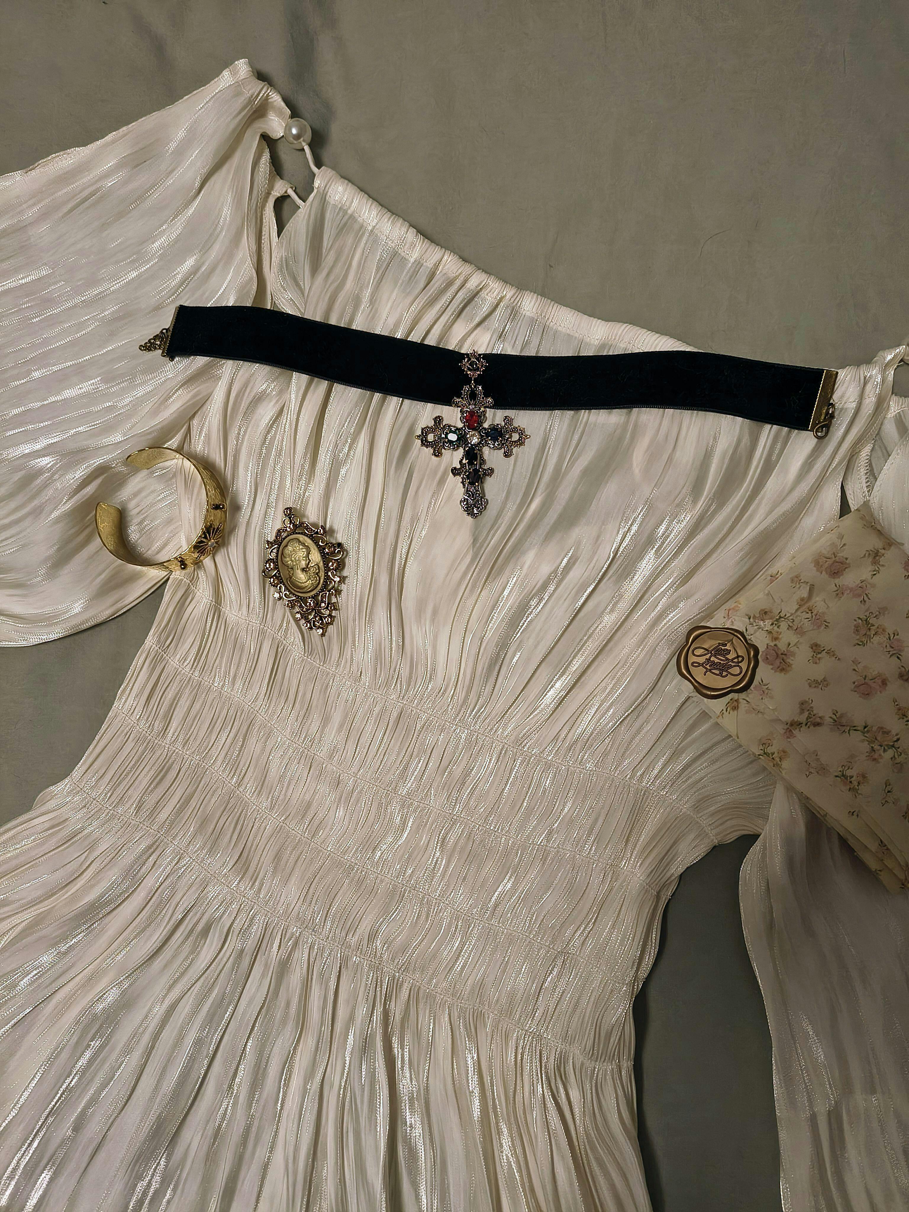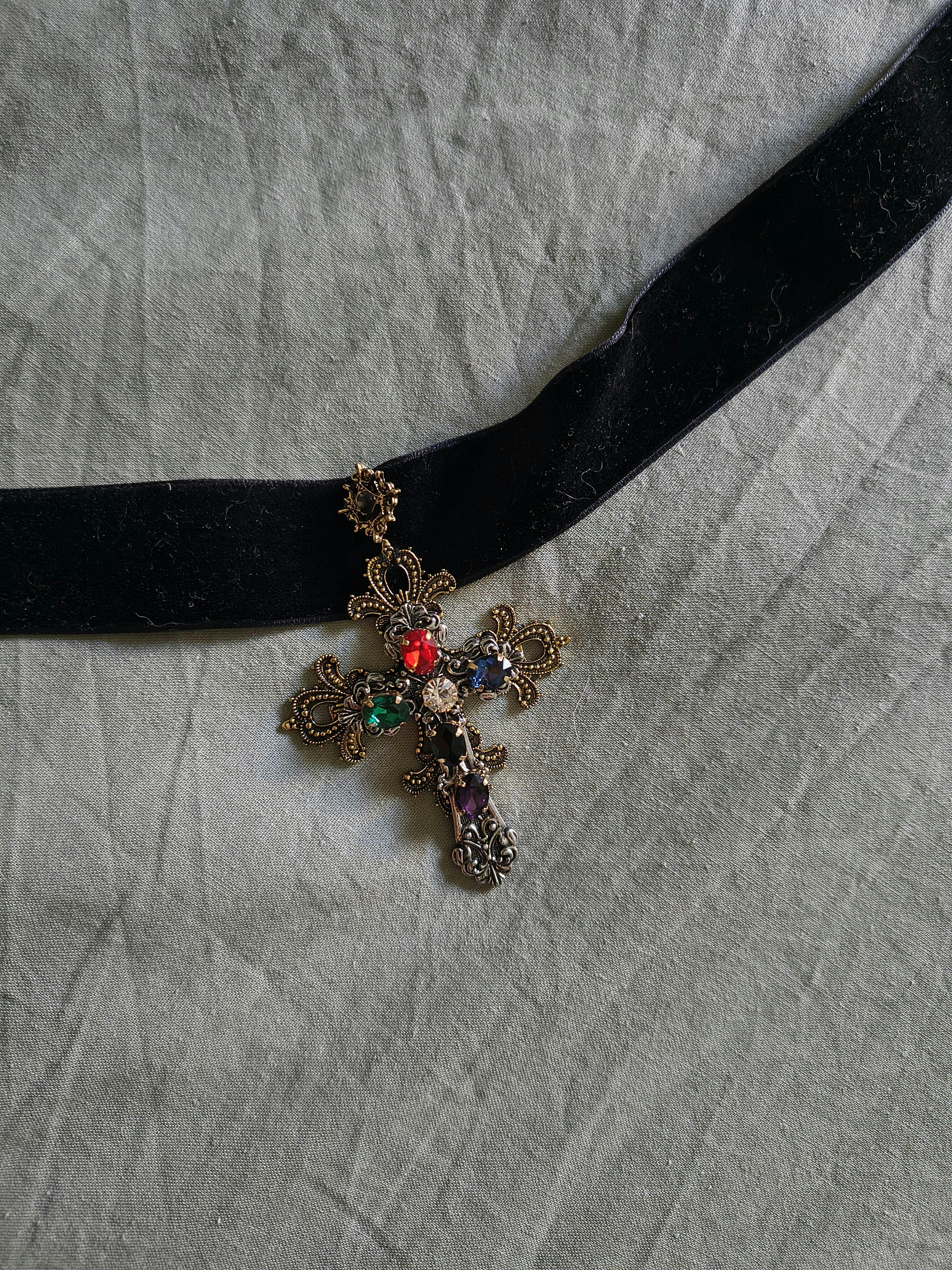 This choker is composed of several elements. The Velvet ribbon is easy to close with a hook, then there the small medallion on the ribbon, which connects to the cross. The cross is made of two overlapping crosses, one square and golden, and one regular silver color one, then there are 6 rhinestones added on top. My first choker arrived damaged, so I removed the stones from it in an effort to salvage it, and the second one arrived in good condition.