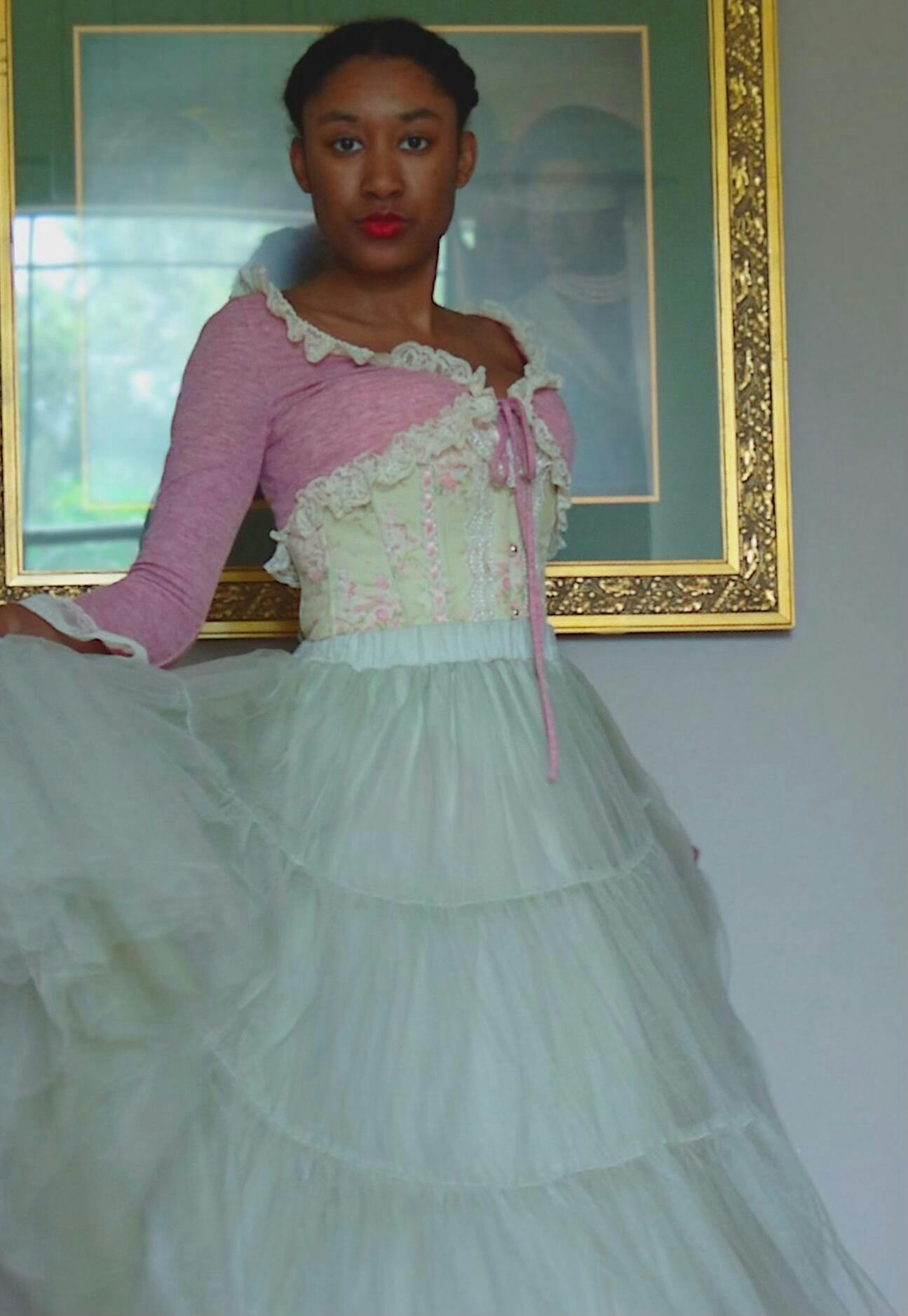 a bit short in the sleeves and tight but maybe I should’ve sized up to a small :/ but the last time I got a small it was too large in the shoulders and wouldn’t stay on. My shoulders are very small but I have a larger bust. It’s a strange dingy pink too, not soft like most Lacemade pinks are. My arms must be too long and thin because the lace doesn’t reach my wrists