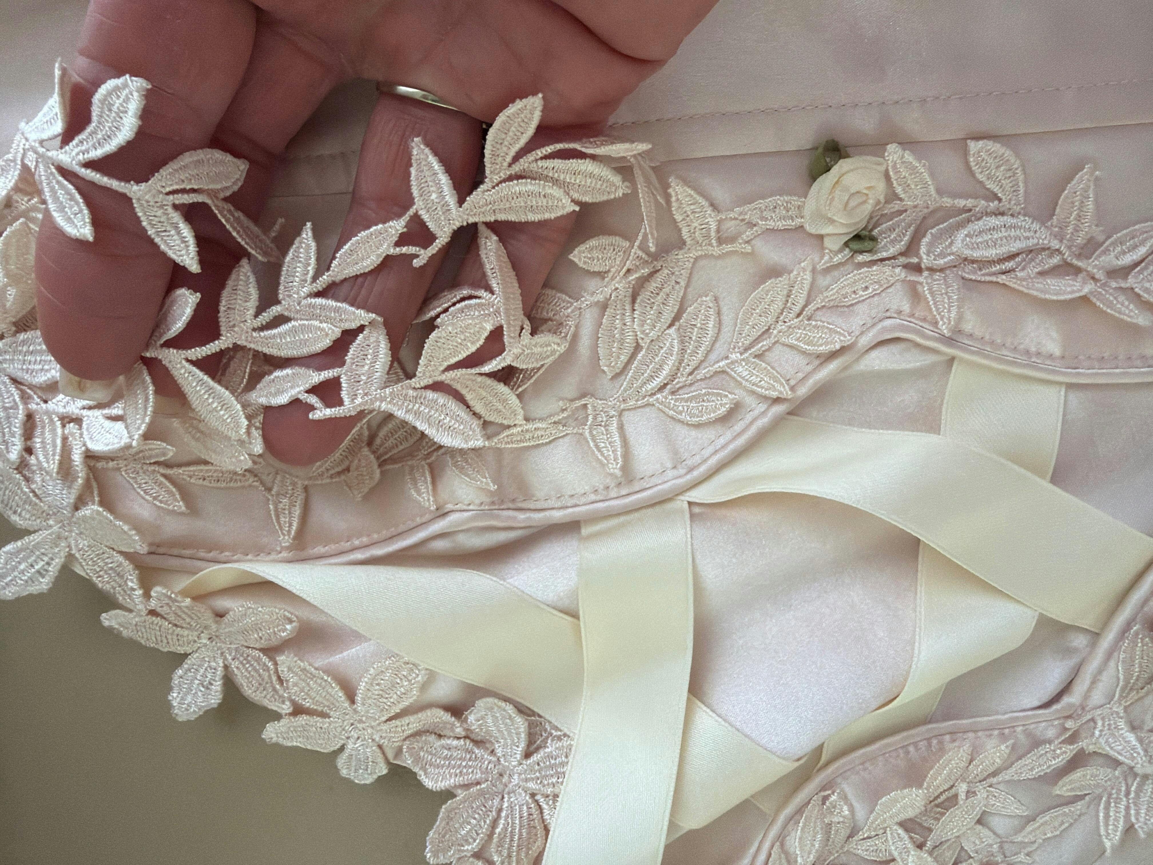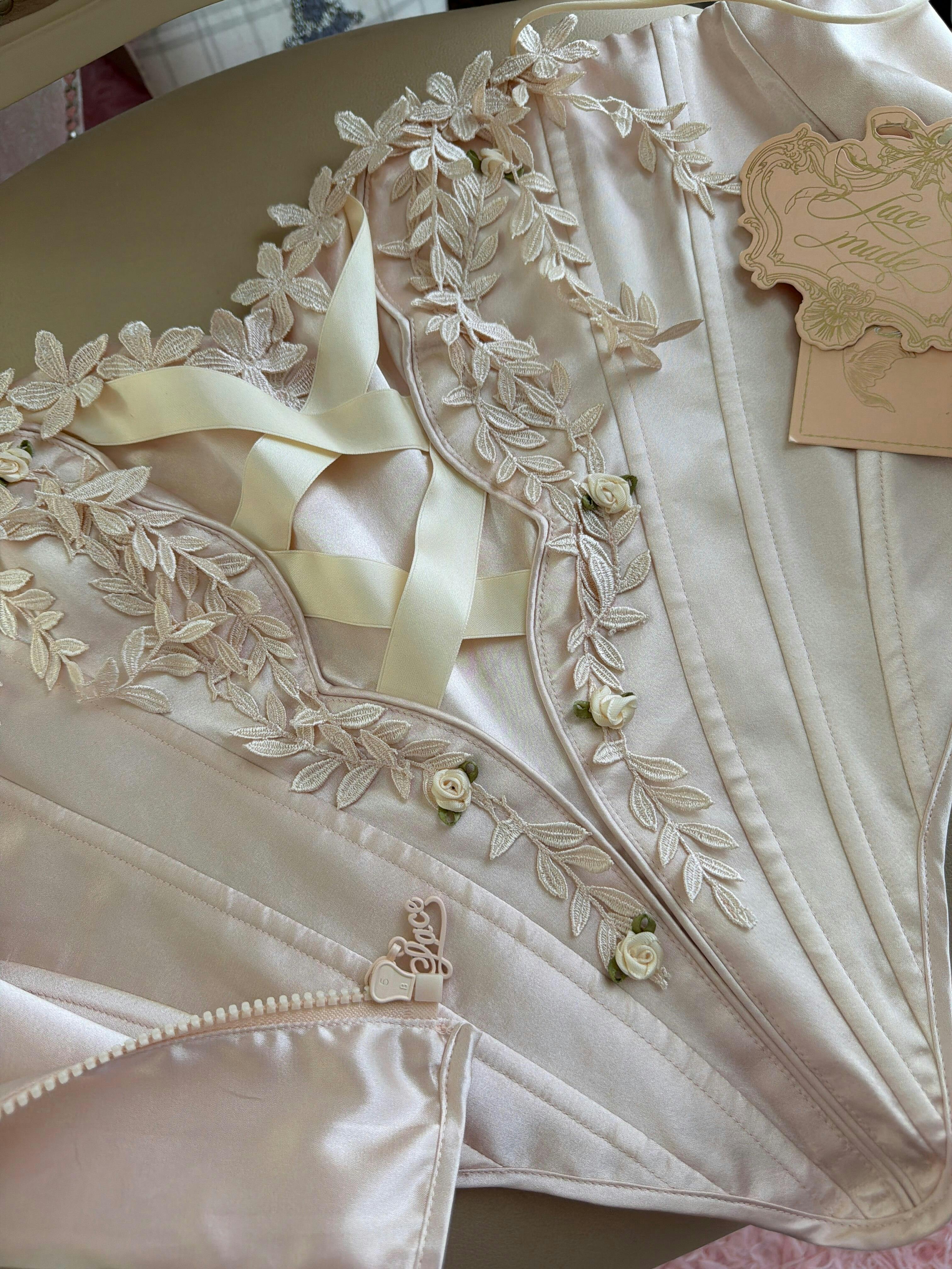 The ribbons, the lace, the satin all flow so beautifully together.. the delicate straps are stretchy & very comfortable. The deep v in front is very flattering & covers the front waistline of the skirt perfectly. It has a zipper closure in the back so it’s very easy to get into. It is definitely fairy tale inspired