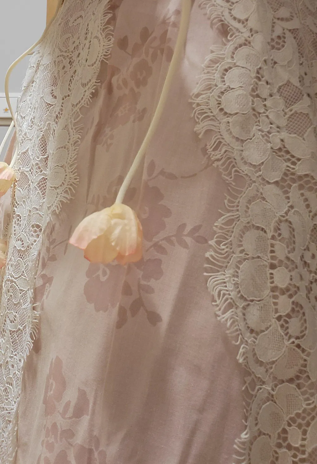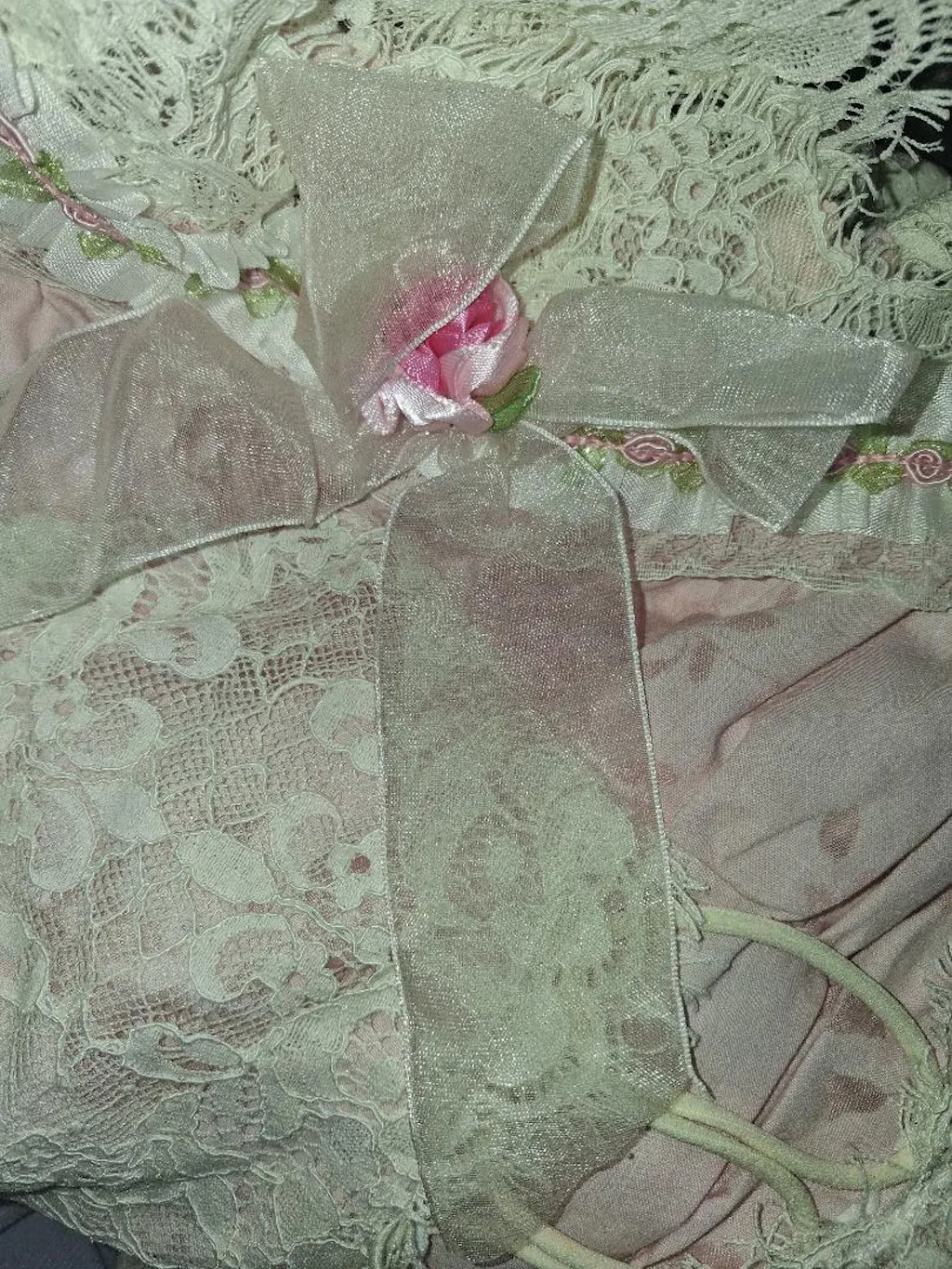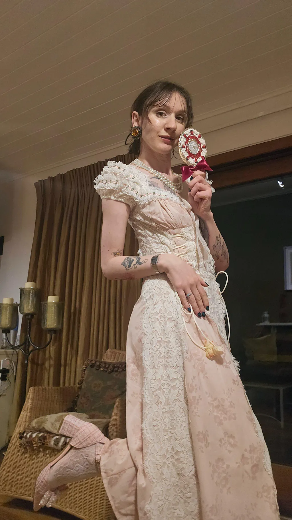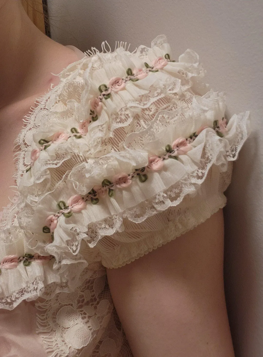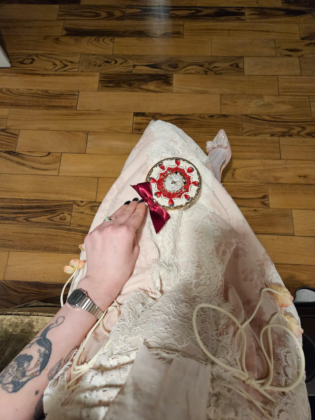 The fabric is soft and silky with a beautiful drape. All the tiny details are so lovely. The sleeves are completely stunning. The laces have flowers attached to the ends. The bow on the neckline is a really cute addition. It zips up the back with lacing at the front-sides.