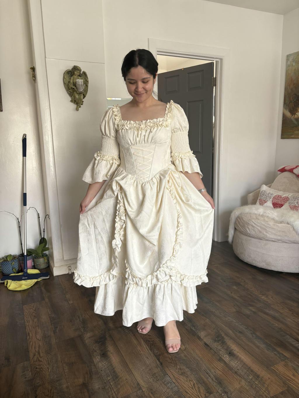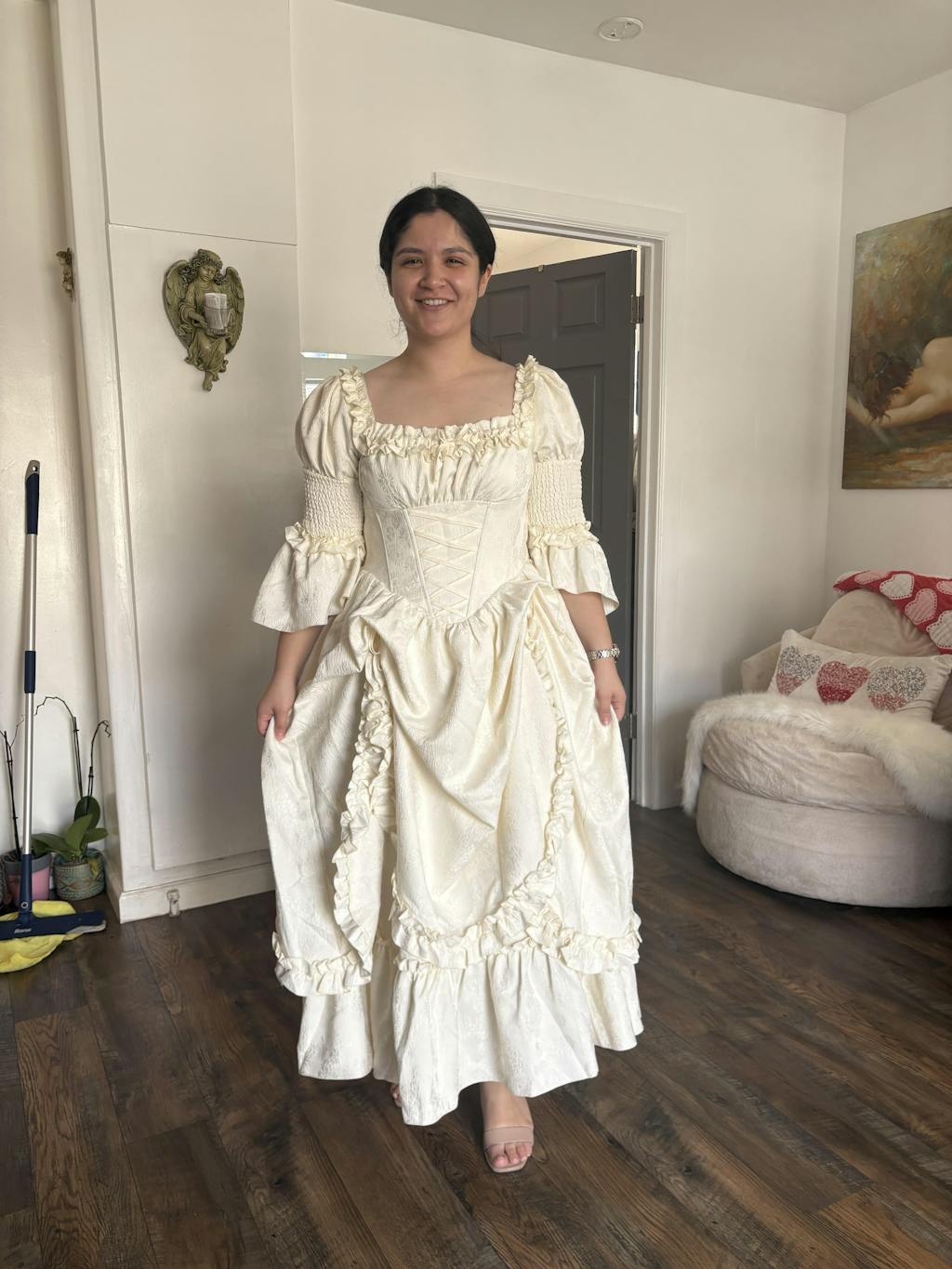 I am quite happy. I purchased this with many hopes of wearing different corset looks with it. But even without the corsets it makes me feel confident. The fabric is lovely and non irritating. It is thick, so it can keep you warm. Just be aware of that if it's hot. I'm very happy with the dress and will plan on wearing it to future parties and ren fairs.