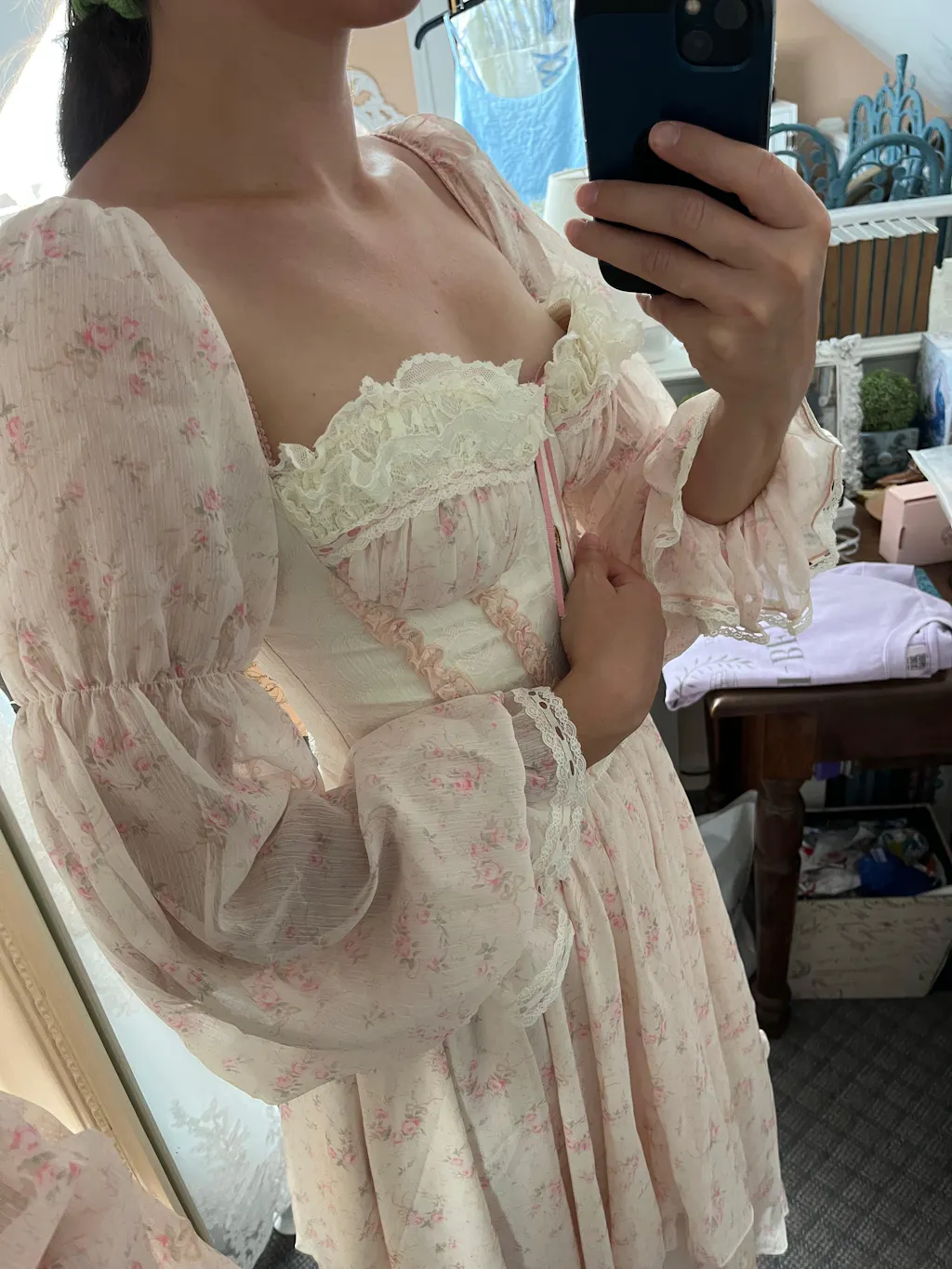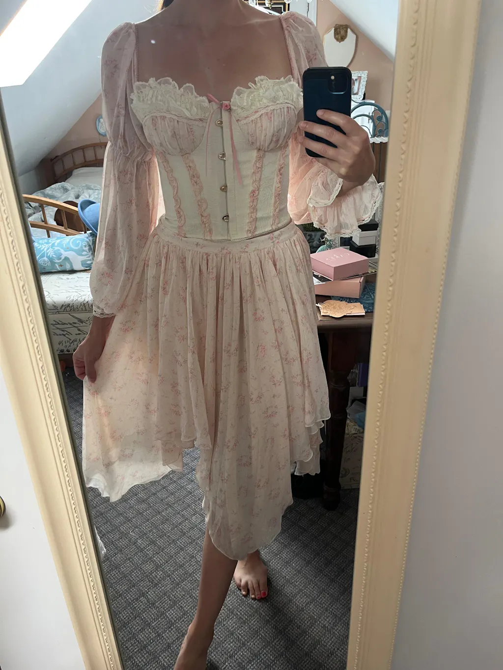 This corset is so dreamy! I am normally a size small or medium in Lacemade corsets, but for this corset I went with a medium. My measurements are 34” bust and 27” waist. The medium was perfectly snug in the waist, but I have some gapping in the cups. However, I don’t think I could have sized down or the waist would have been too tight! But I think a little fashion tape will fix the issue :) I got the matching skirt as well and they are gorgeous together!