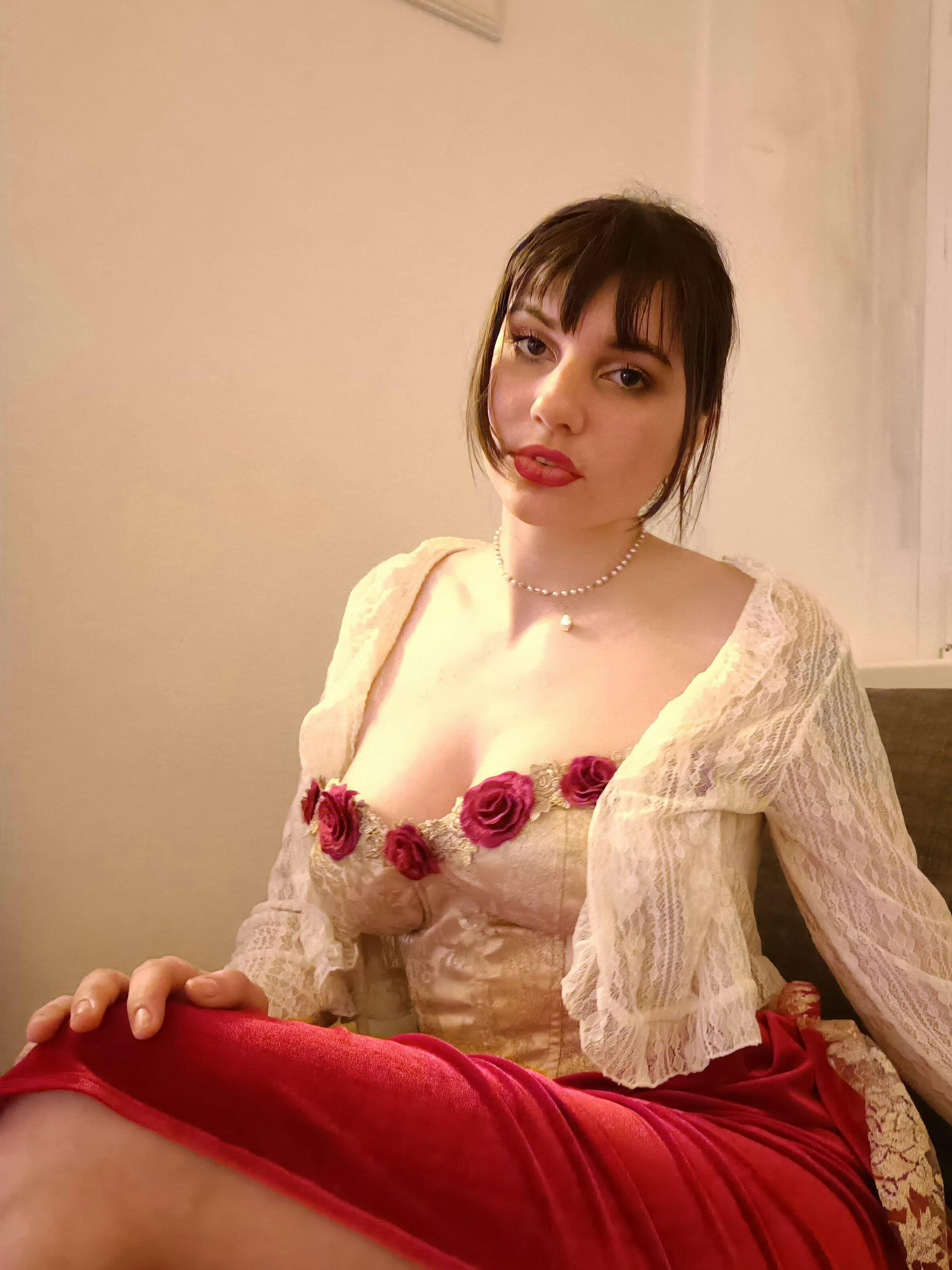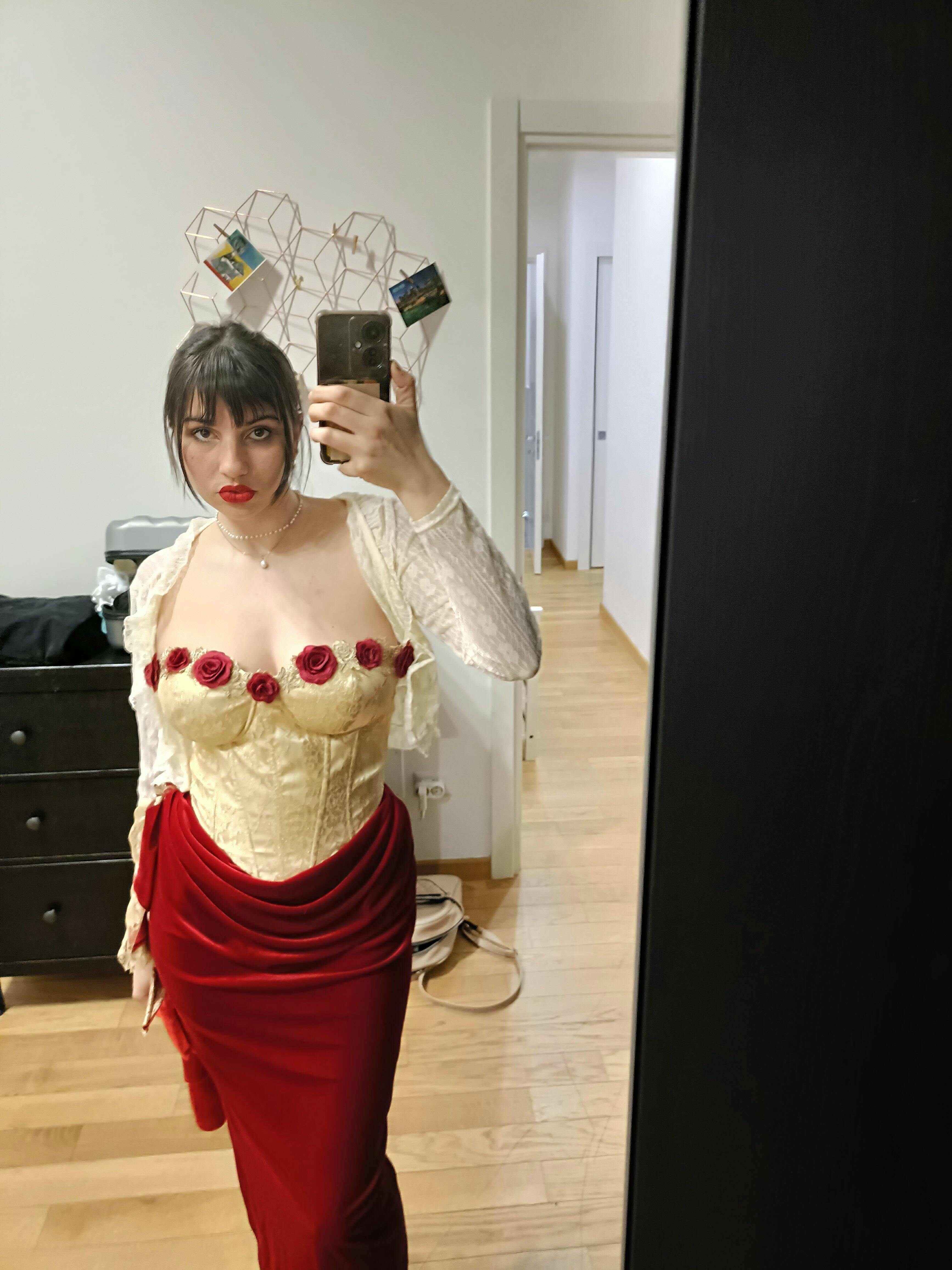 I've already seen others mention this, but the corset does not hold you in if you have a large chest, and the boning feels cheap and also pokes you. Also, the laces are very thin and slippery, so it is impossible to lace yourself up. They definitely need more grommets. I can easily zip or lace myself up in other clothing or proper corsets, but not this one. I know they have done better with their other lace-up products, so I was disappointed as I couldn't wear it to the event I had planned to wear it to. That being said, the coloring and look is quite beautiful. It doesn't have a lining, but the skirt part never rode up when I tried it on. The fabric feels nice, too. The roses get squashed during shipping, so make sure to fluff them up. Overall, for $69 dollars before shipping fees, I wish I didn't have to turn this into a DIY project, especially because it's so pretty. If you can spare the money and time, go for it. If you are aiming for "perfectly wearable out of the package", buy an actual corset and a skirt separately elsewhere. (wish I could show a picture, but as I said, couldn't get the thing on fully)