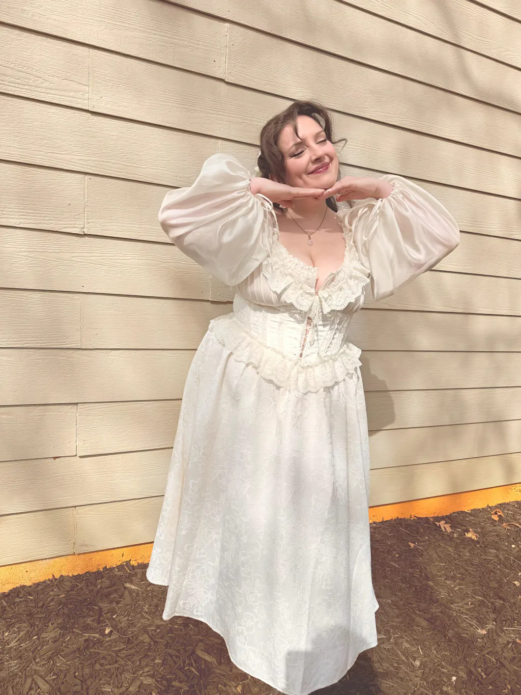 So when I first saw this dress, of course the first thing that came to mind was Christine Daae's dress from the James Cameron movie, the dress when the Phantom leads her through the mirror and down to his lair while they sing the song. Of course I feel like Christine Daae in this beautiful dream of lace and satin! The top part is so delicate and ephemeral I really do feel like an angel of music while wearing it!