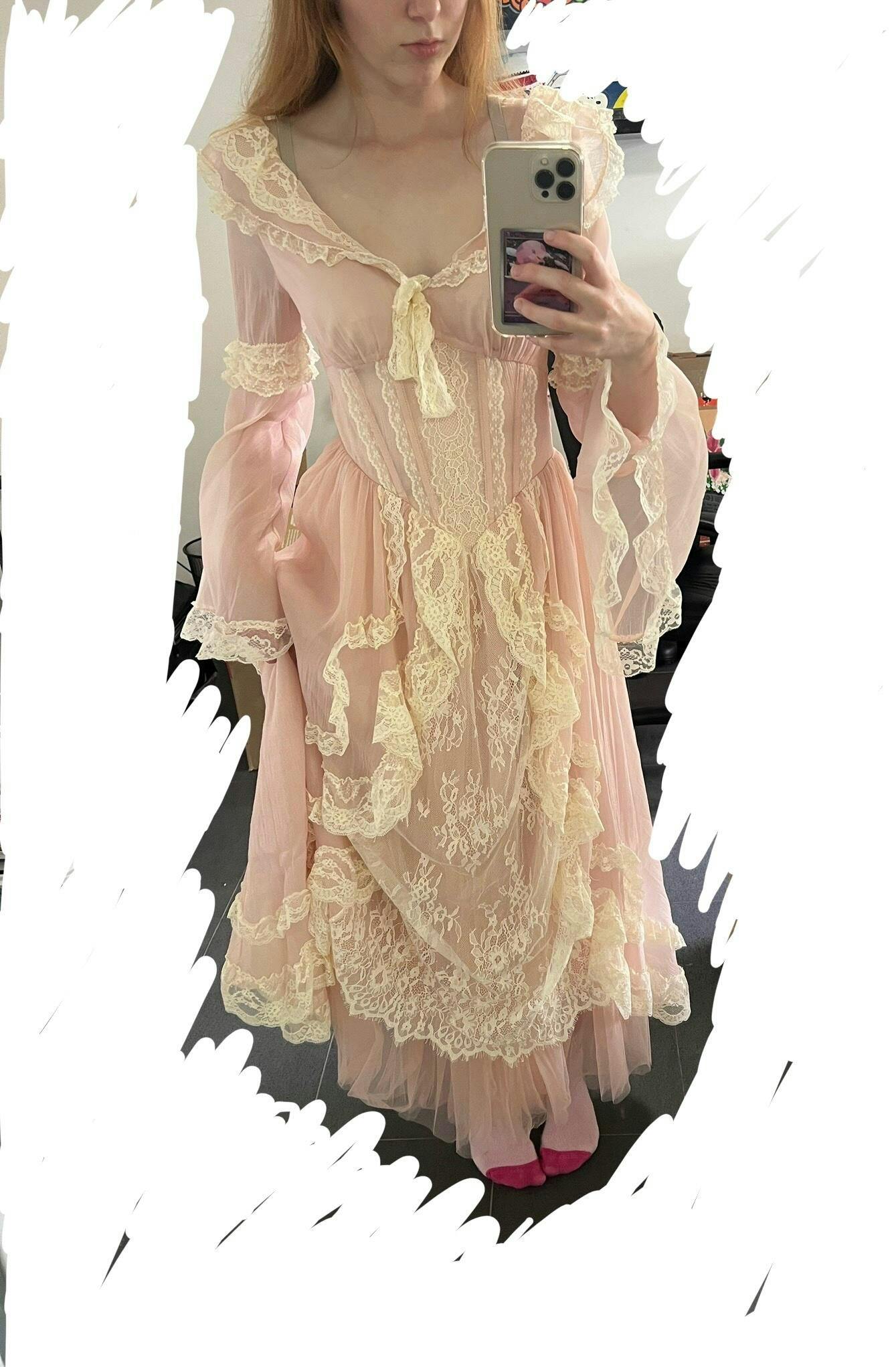 I am wearing a M, usually I can wear a S - XS in au sizing so make sure you measure yourself to compare to their sizing sheet incase it sizes you up. I was worried about previous reviews saying it’s a cheap material and that the sleeves are tight but I found it to be comfortable, not tight and while I’m not an expert in material, to me it seems very well made. Only problem I’ve come across is needing someone to help me get out of the dress as well as tying the ribbon round my back. Plus it is hard to raise arms but it is very princessy. I have no idea where I’ll wear this too but gosh it’s so beautiful.
