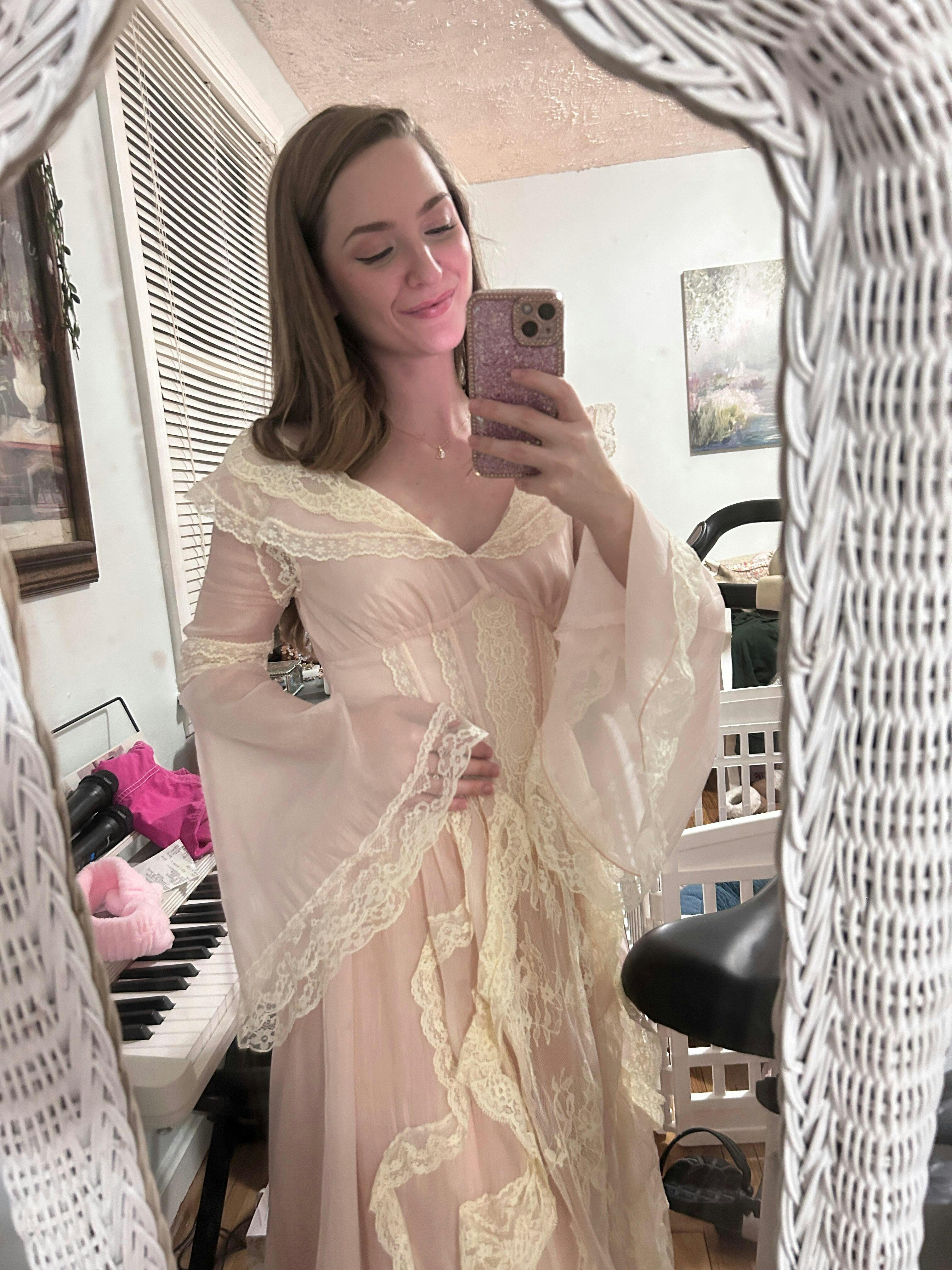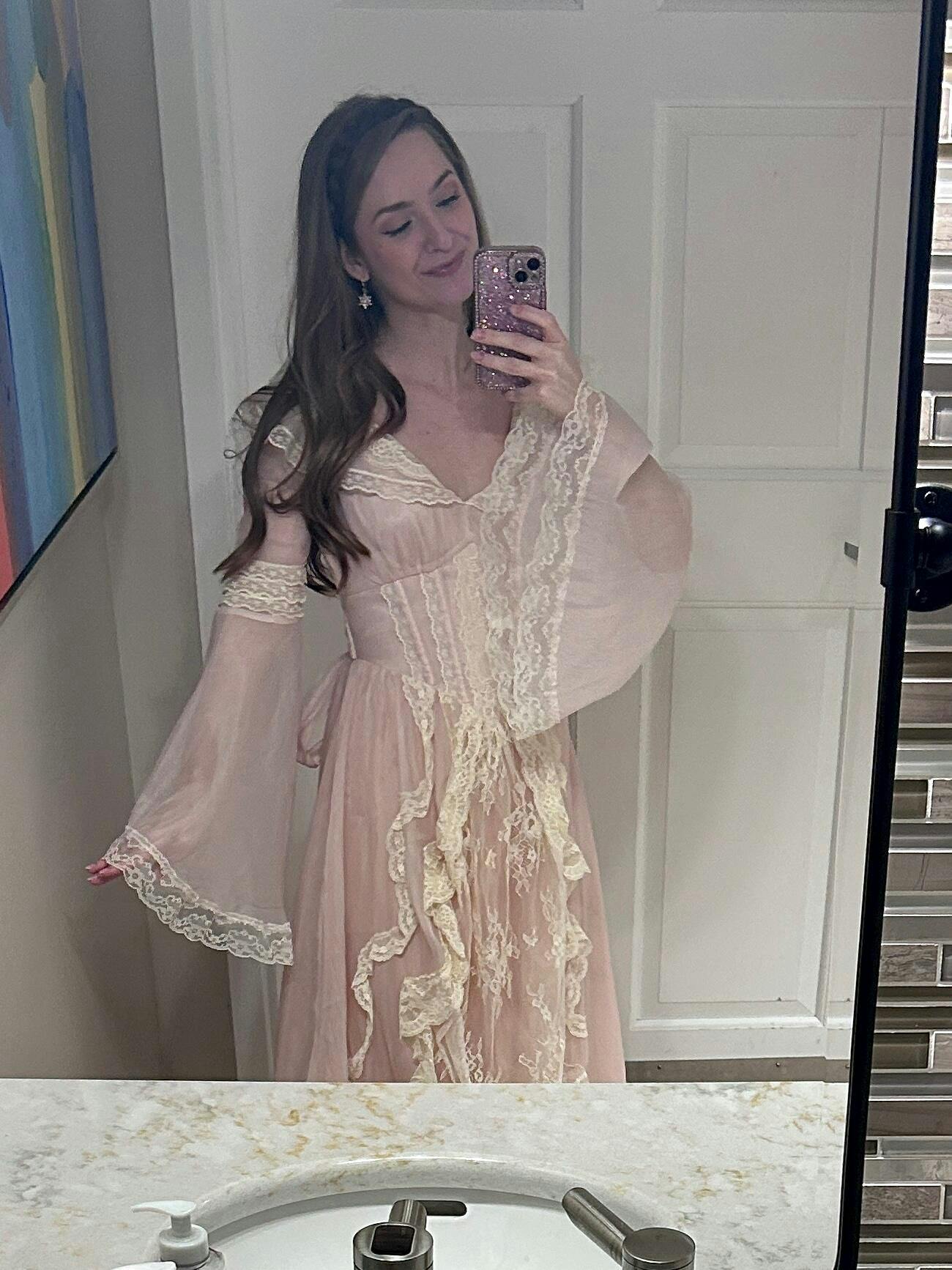 This dress is so beautiful and flowy! I feel like I stepped out of a fairytale when I wear it. The problem though is that the way the armpit and sleeves are structured, makes the top of the sleeves so tight. I got an XS and it fits my waist, and is a little roomy in the bust but still okay (I use a piece of clothing/bra tape in the bust to help with that) I had little arm movement and wasn’t going to be able to wear the dress like that. But I was determined to wear this dream dress. So I ended up removing the lace bow from the bust, removing the sleeves, and sewing the lace material from the bow between the arm pit and sleeve.