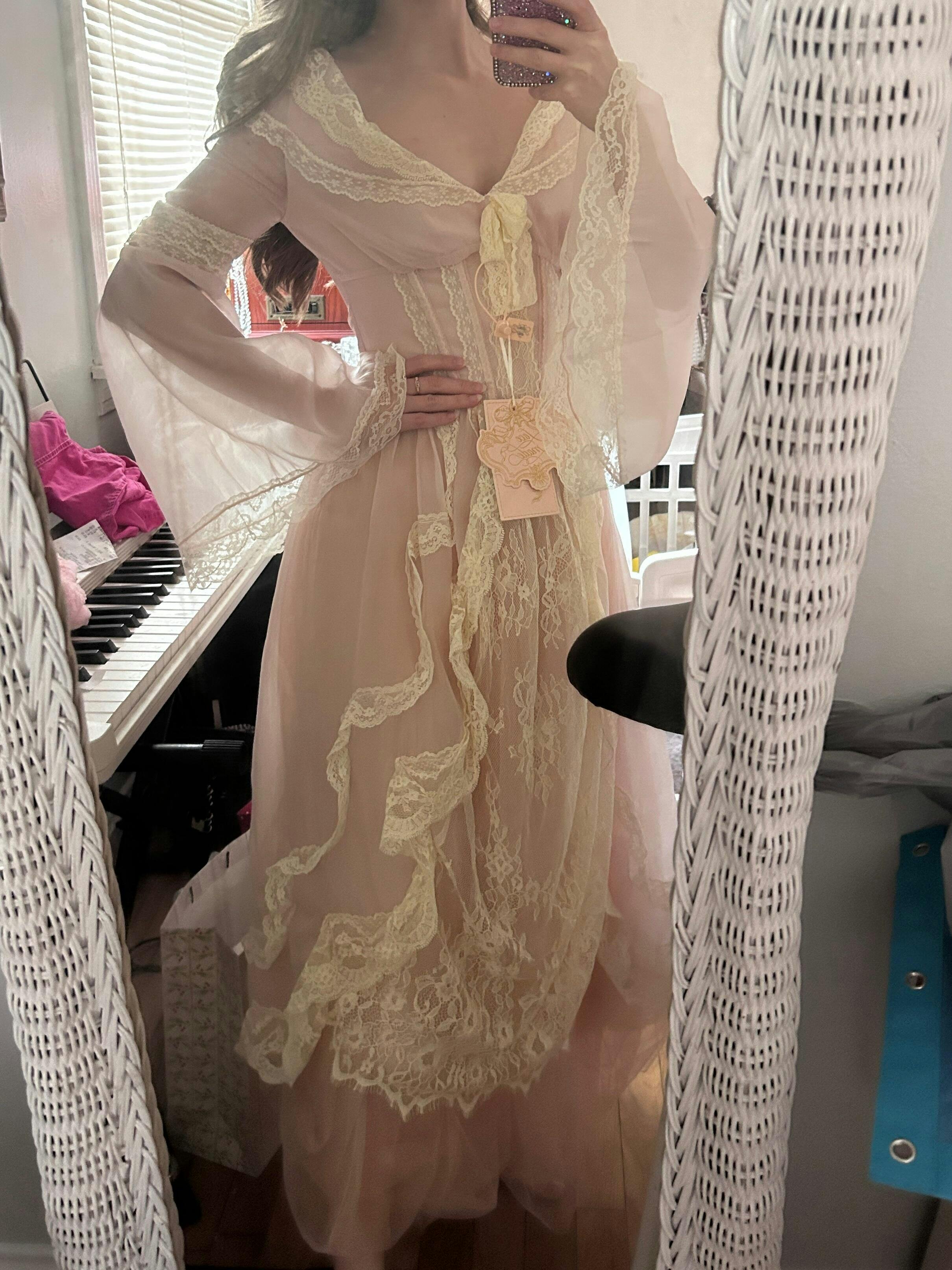 I am wearing a M, usually I can wear a S - XS in au sizing so make sure you measure yourself to compare to their sizing sheet incase it sizes you up. I was worried about previous reviews saying it’s a cheap material and that the sleeves are tight but I found it to be comfortable, not tight and while I’m not an expert in material, to me it seems very well made. Only problem I’ve come across is needing someone to help me get out of the dress as well as tying the ribbon round my back. Plus it is hard to raise arms but it is very princessy. I have no idea where I’ll wear this too but gosh it’s so beautiful.