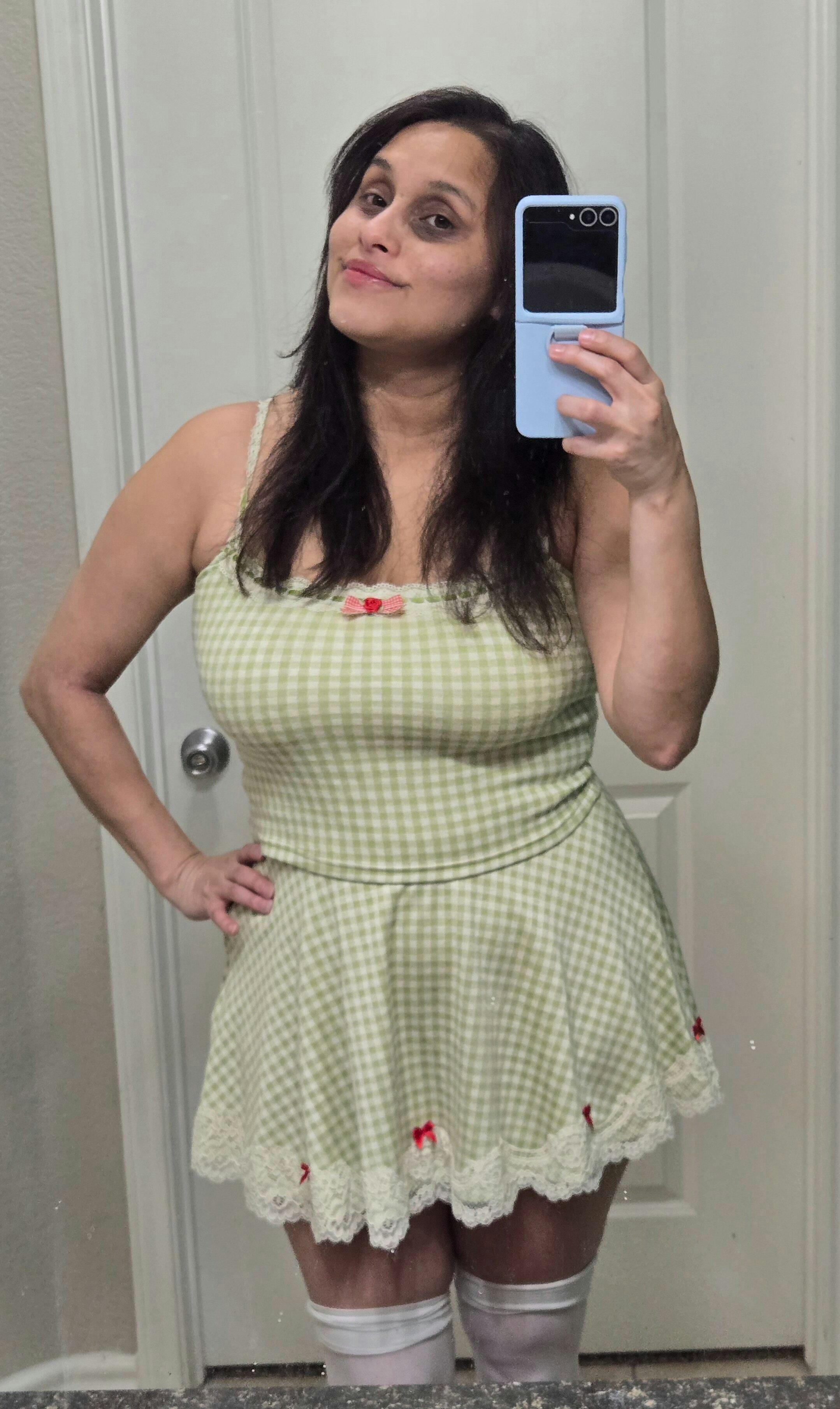 Bought the top, skirt, cardigan, and one of the dresses. I love this pattern and color. This skirt is comfy with built in shorts as well. I wear thos whole set regularly and get compliments on it all the time. :) Would reccommend.