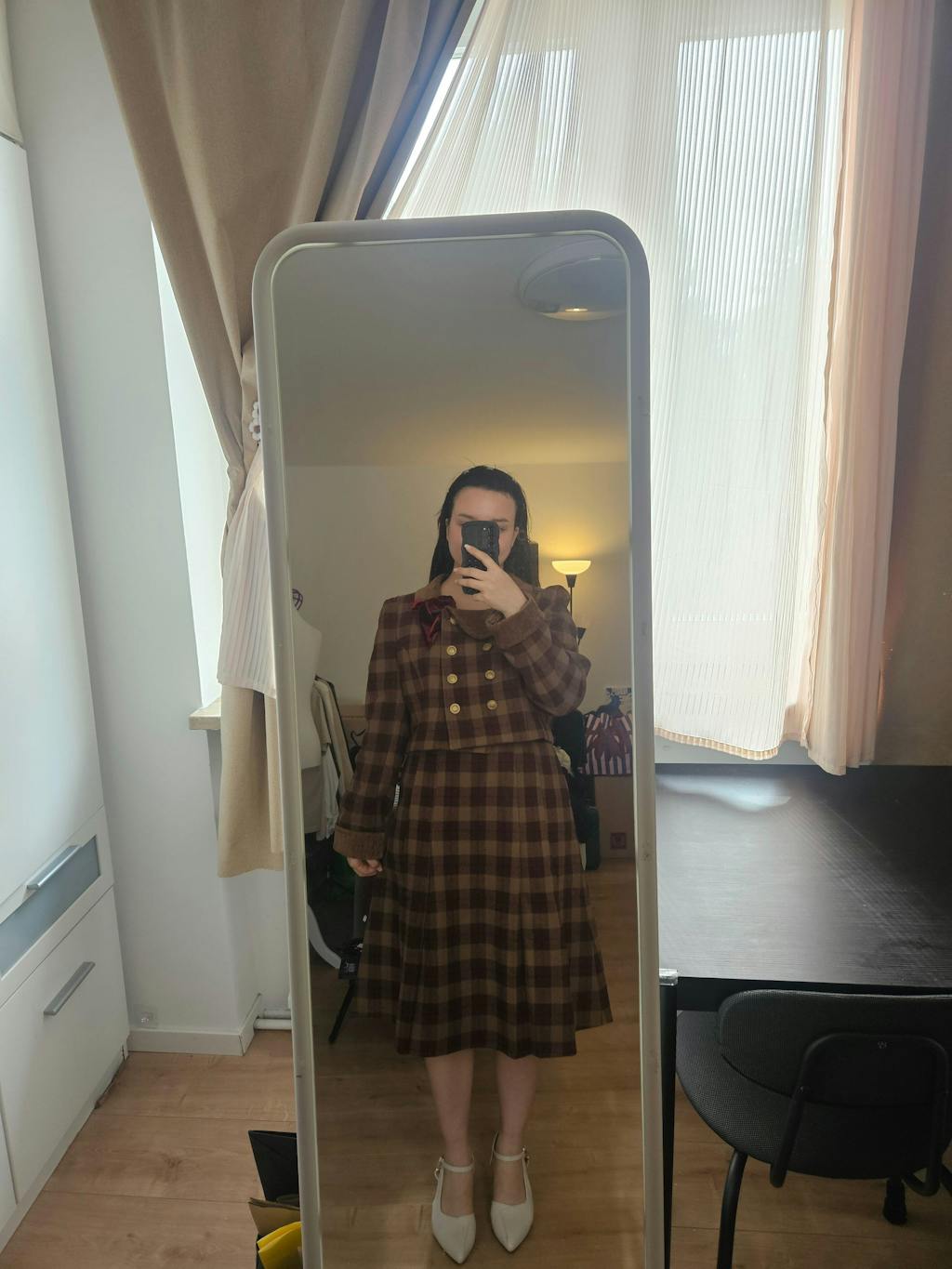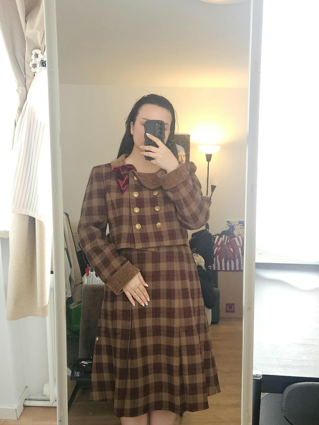 The top is beautiful and thick. My body measurements is 38-28-40, 163cm, i have wide hips so I chose a large size. Maybe for the top, it would be better to size down from large to medium because of the puffy sleeve. And for the skirt, large size is good if you have wider hips.