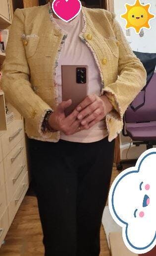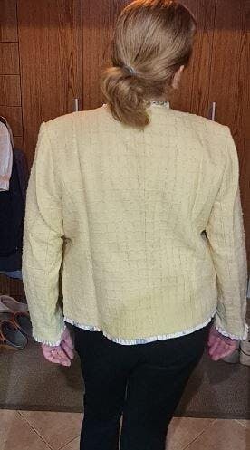 I'm pleased with the quality of this jacket. It is beautiful and made even more elegant with its buttons and dress pattern details.