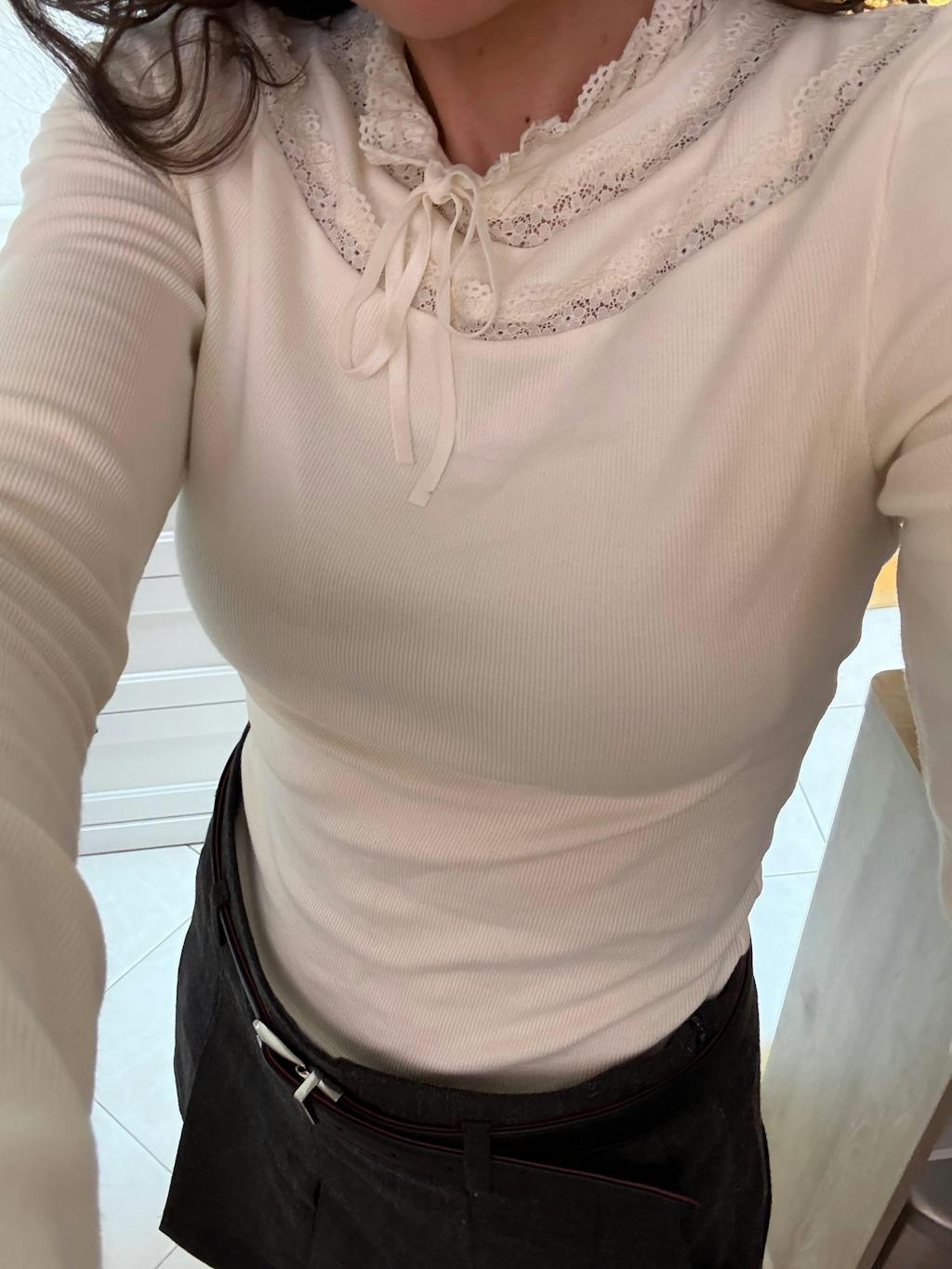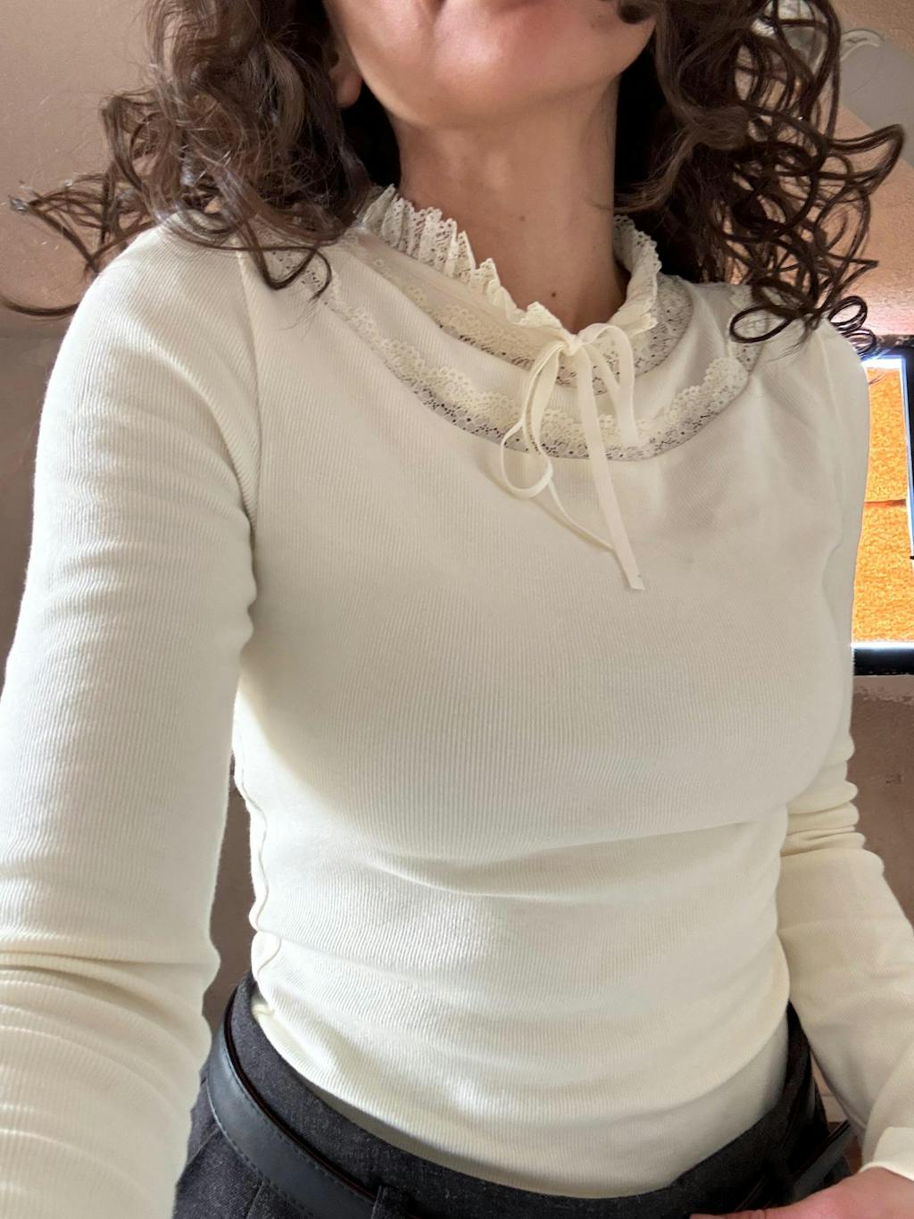 The high lace-trimmed neck and small bow give it a romantic, vintage vibe. It fits nicely without being itchy, and it really feels like a quality piece you’ll reach for again and again.