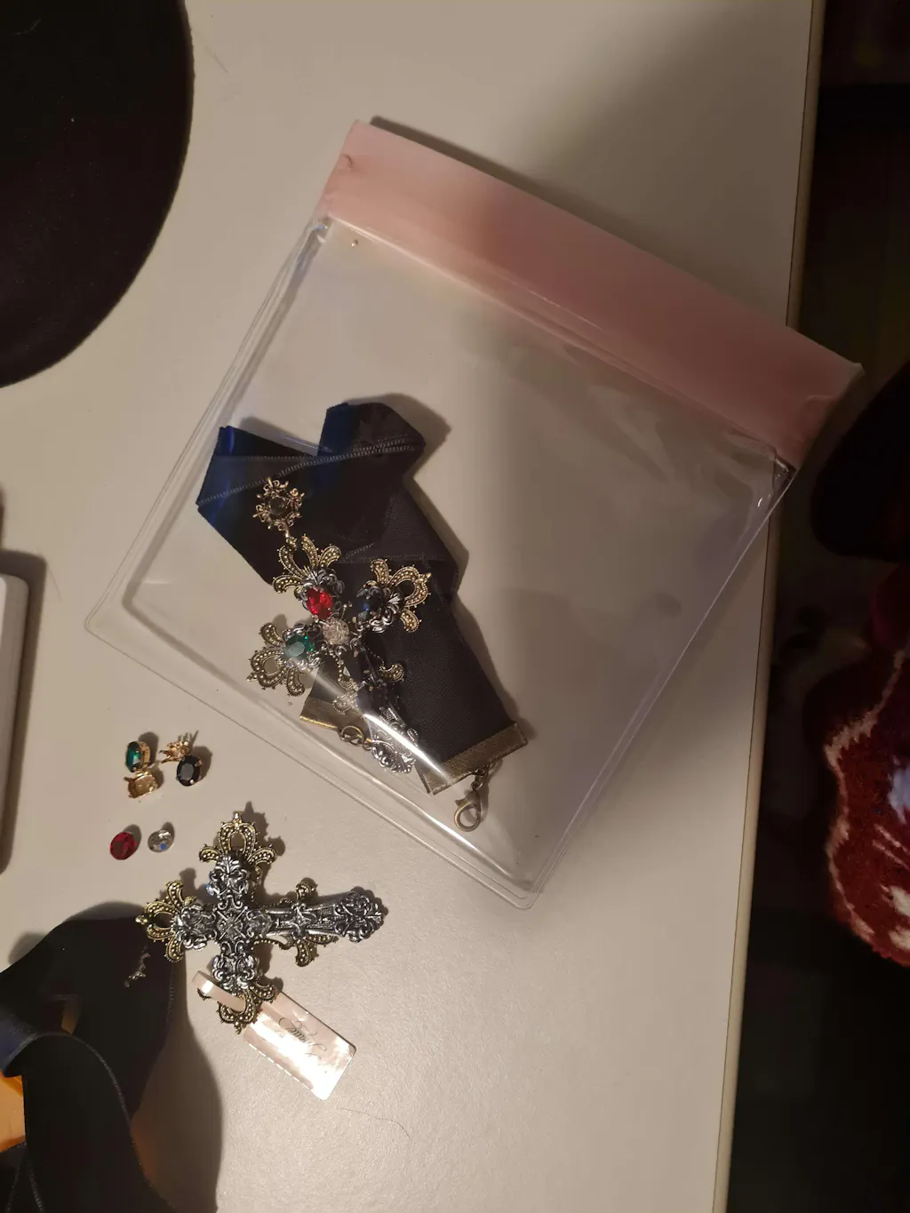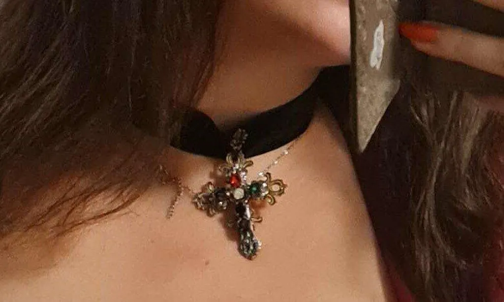 This choker is composed of several elements. The Velvet ribbon is easy to close with a hook, then there the small medallion on the ribbon, which connects to the cross. The cross is made of two overlapping crosses, one square and golden, and one regular silver color one, then there are 6 rhinestones added on top. My first choker arrived damaged, so I removed the stones from it in an effort to salvage it, and the second one arrived in good condition.