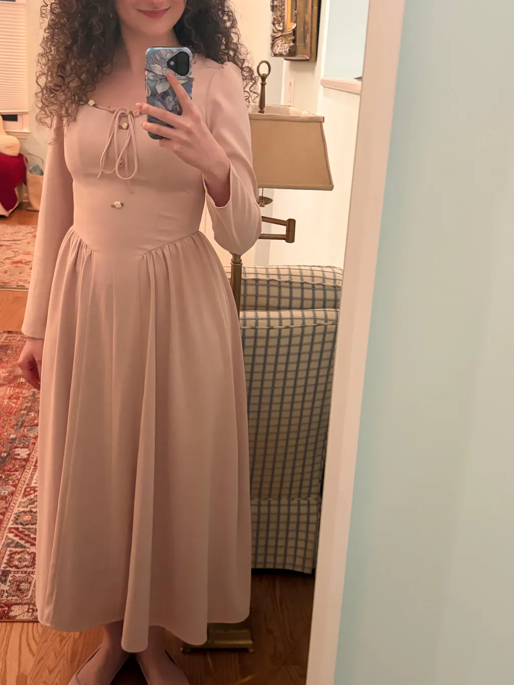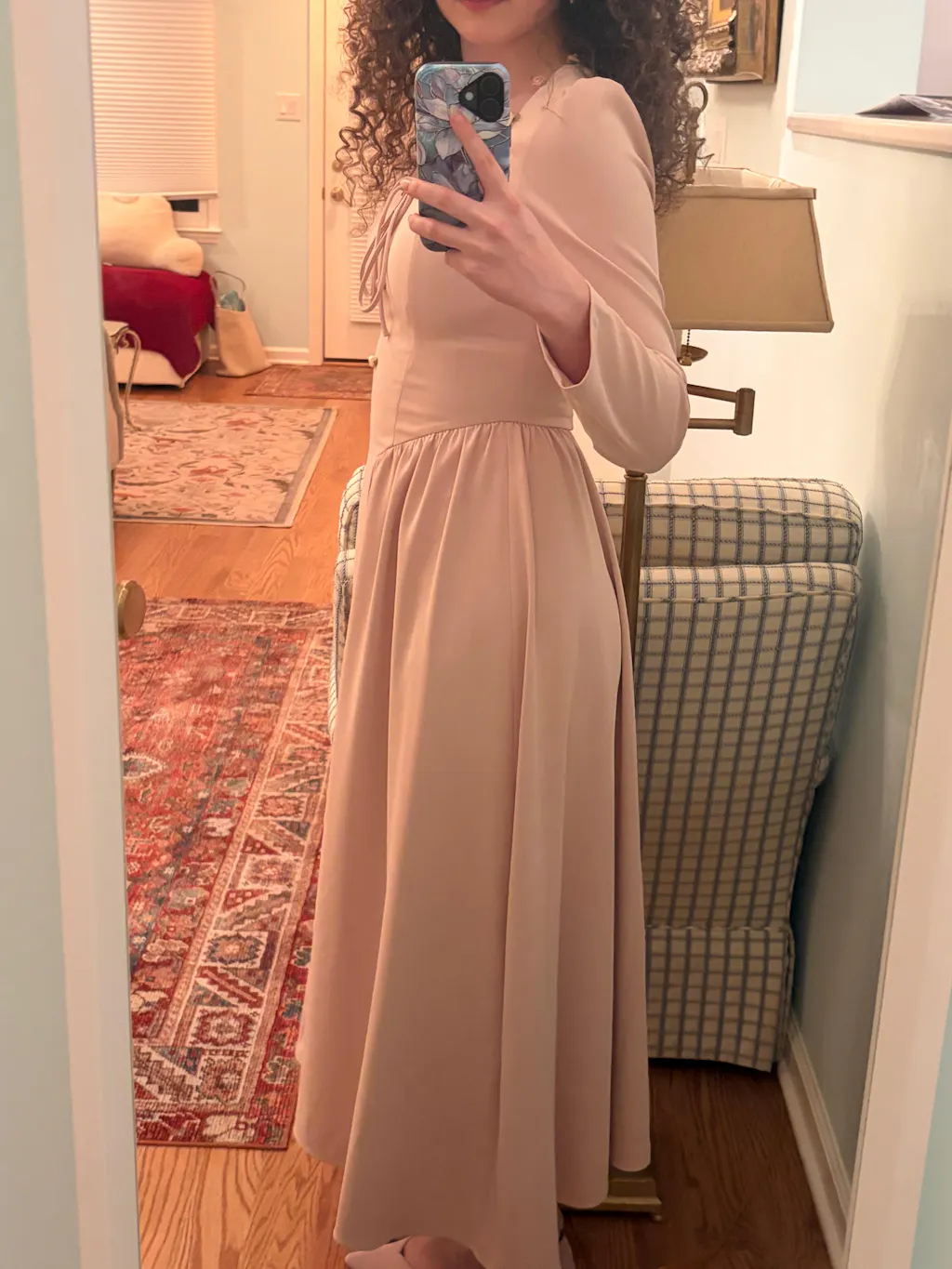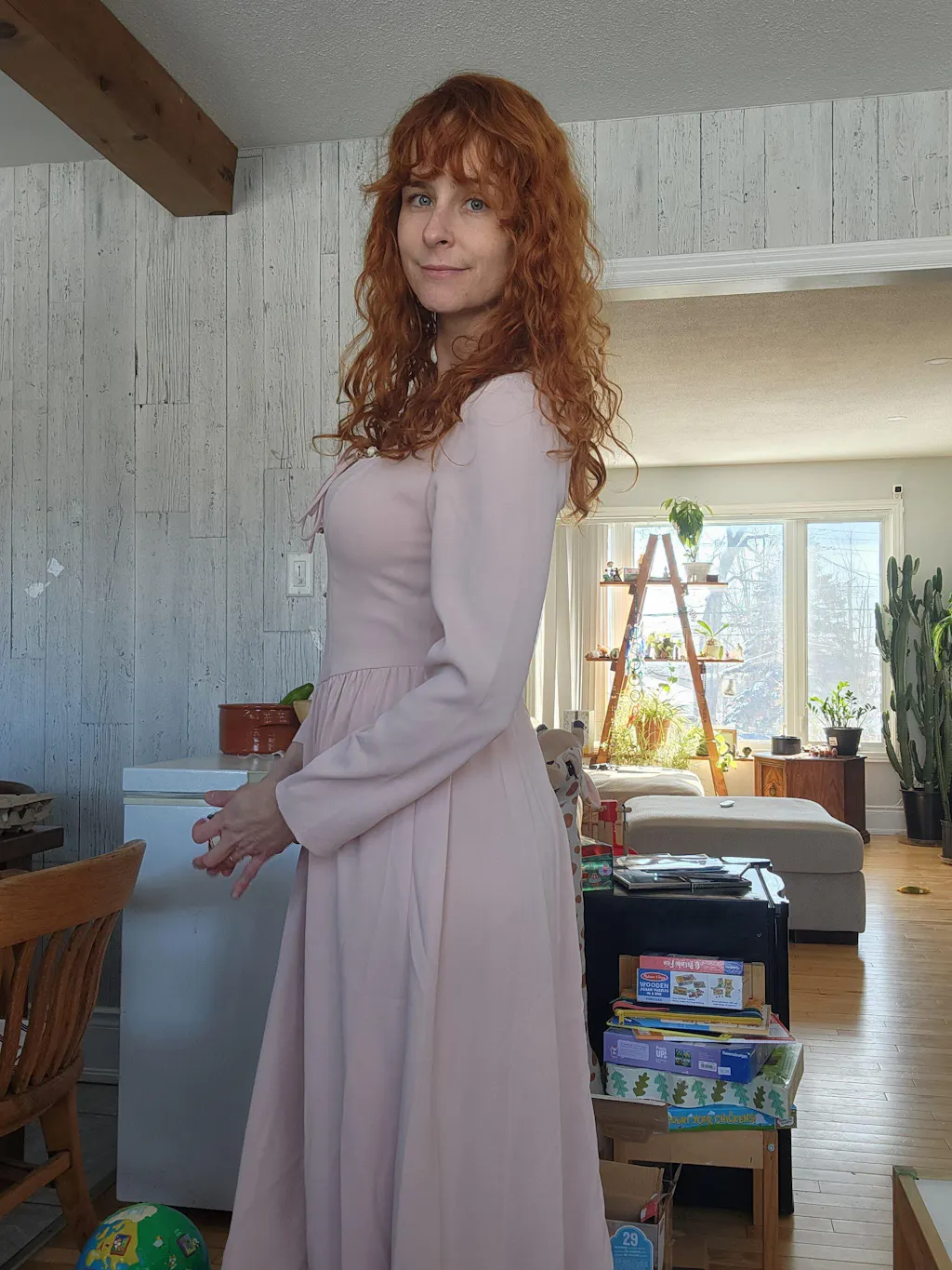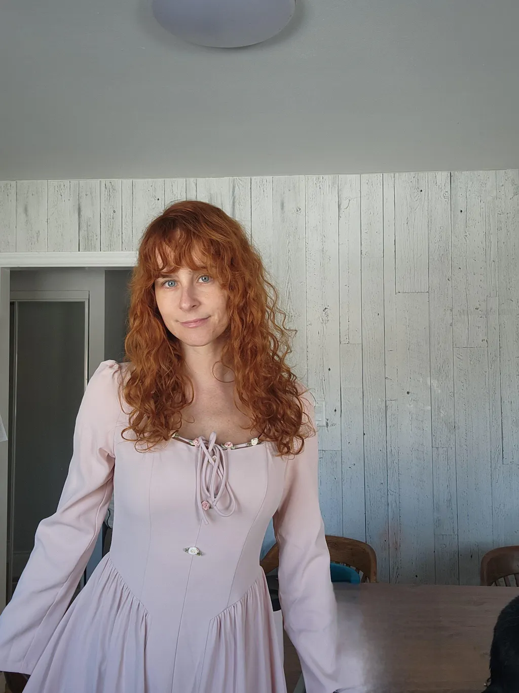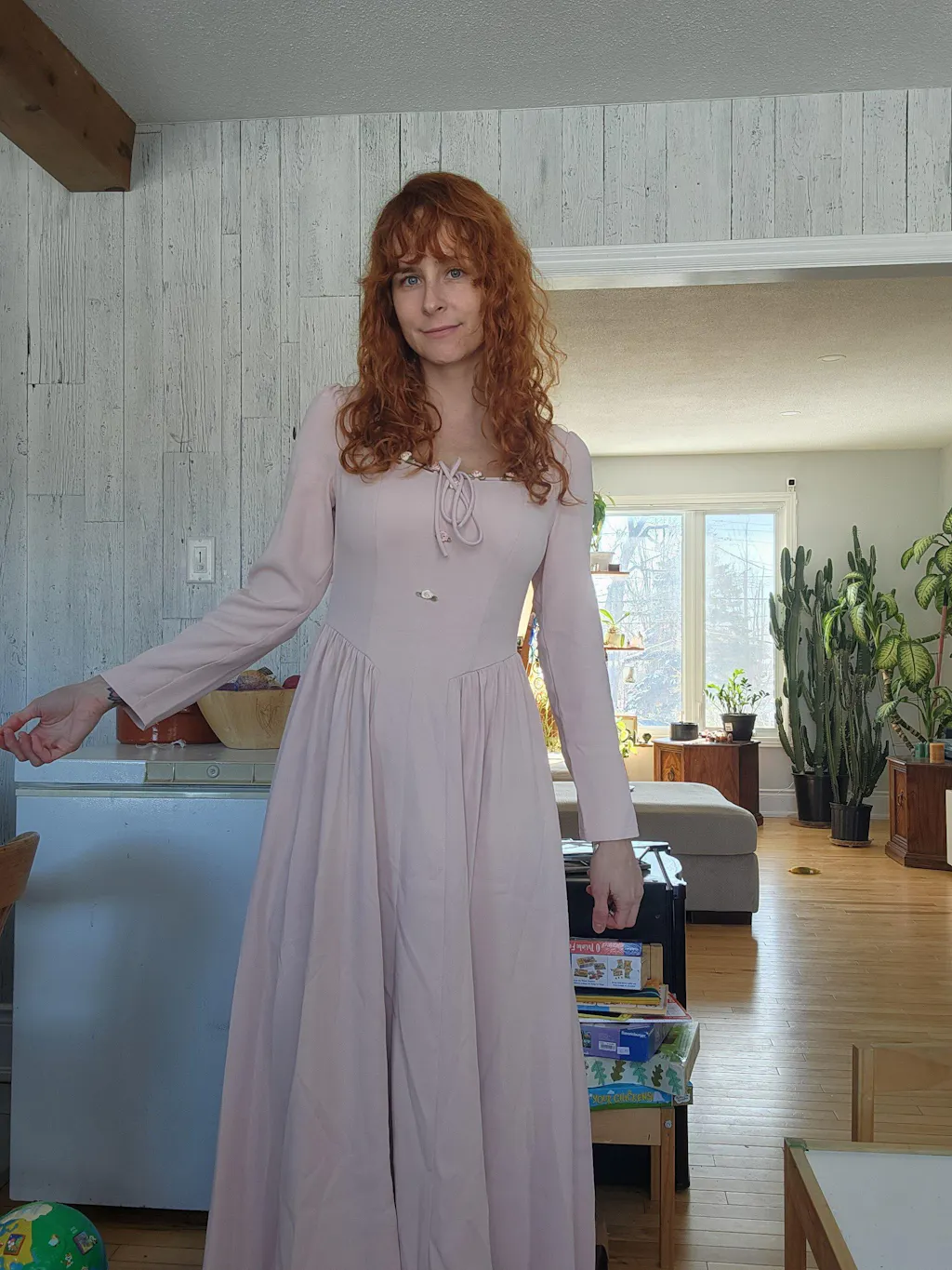 The dress has an airy mood.Very romantic dusty sade of pink.I love it and I wear it a lot. For many occasions.Higthly reccomended.
