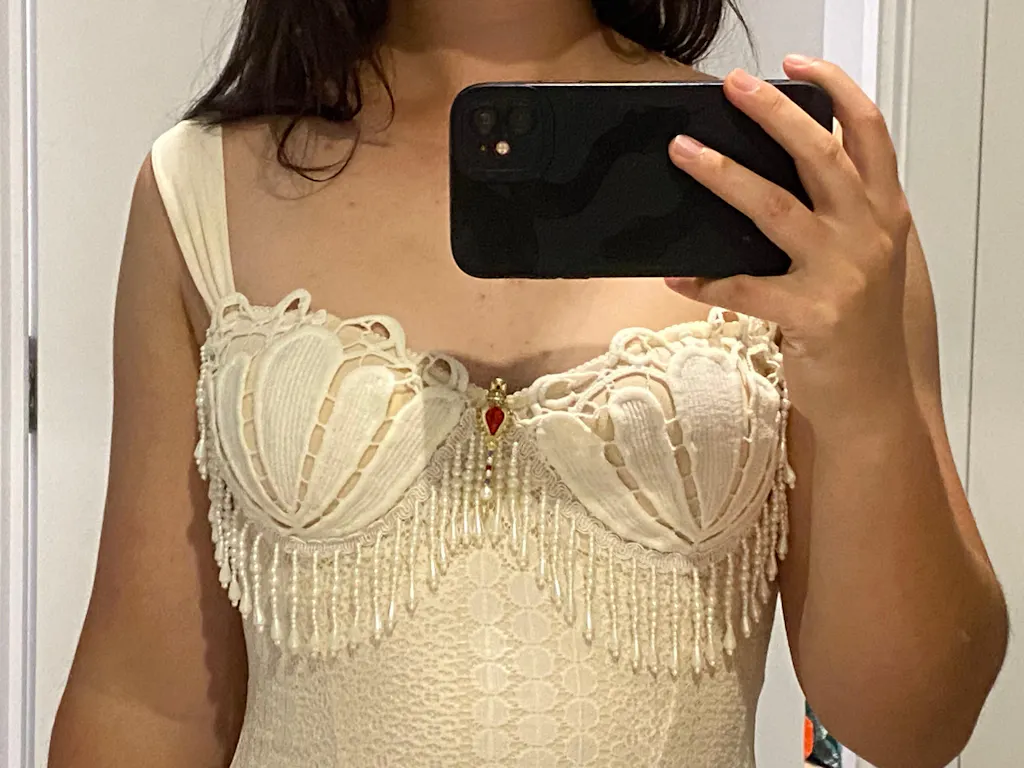 The beads that dangles are so cute with the white dress. That is a great idea for doing the color white it really stands out.