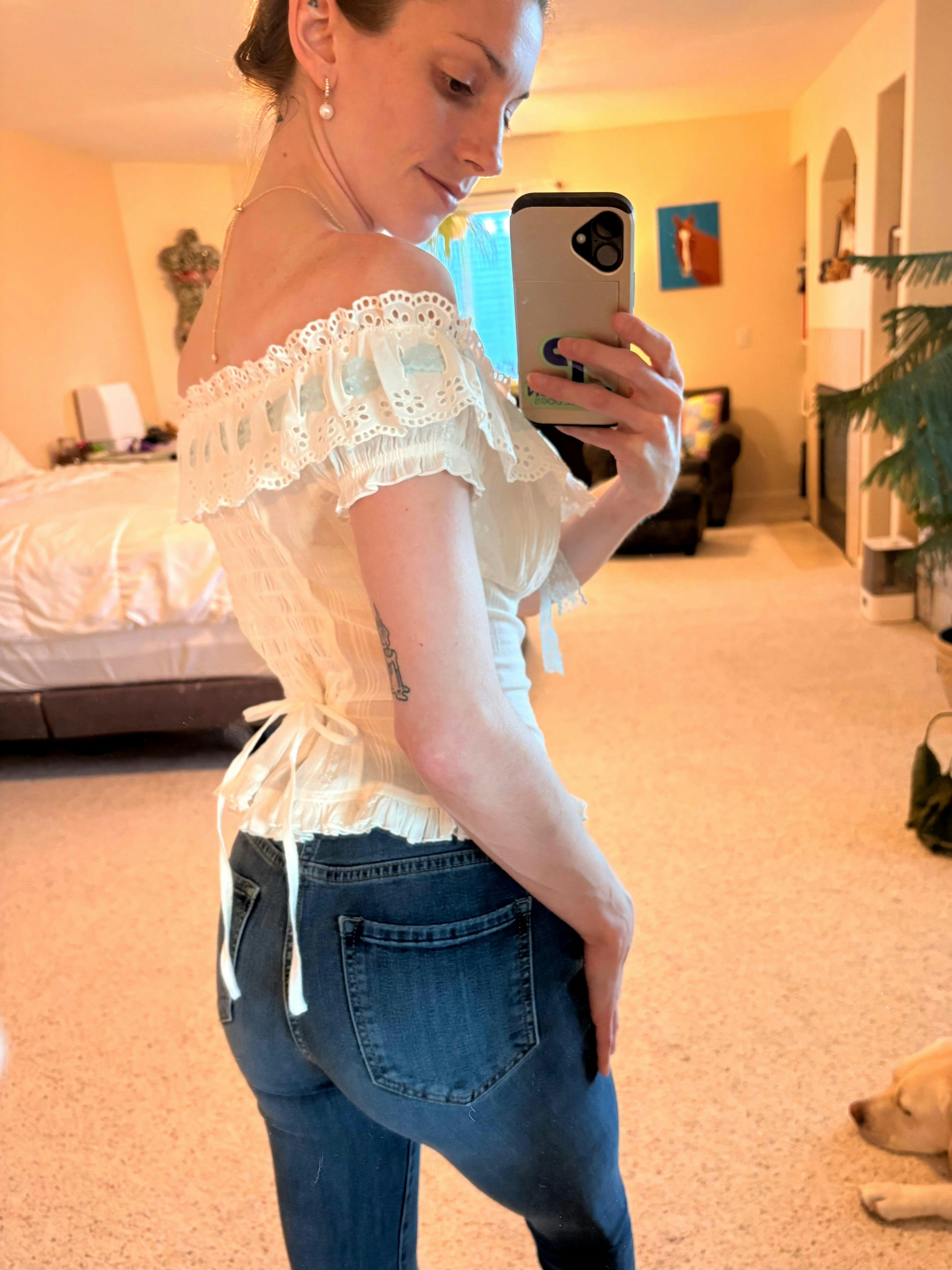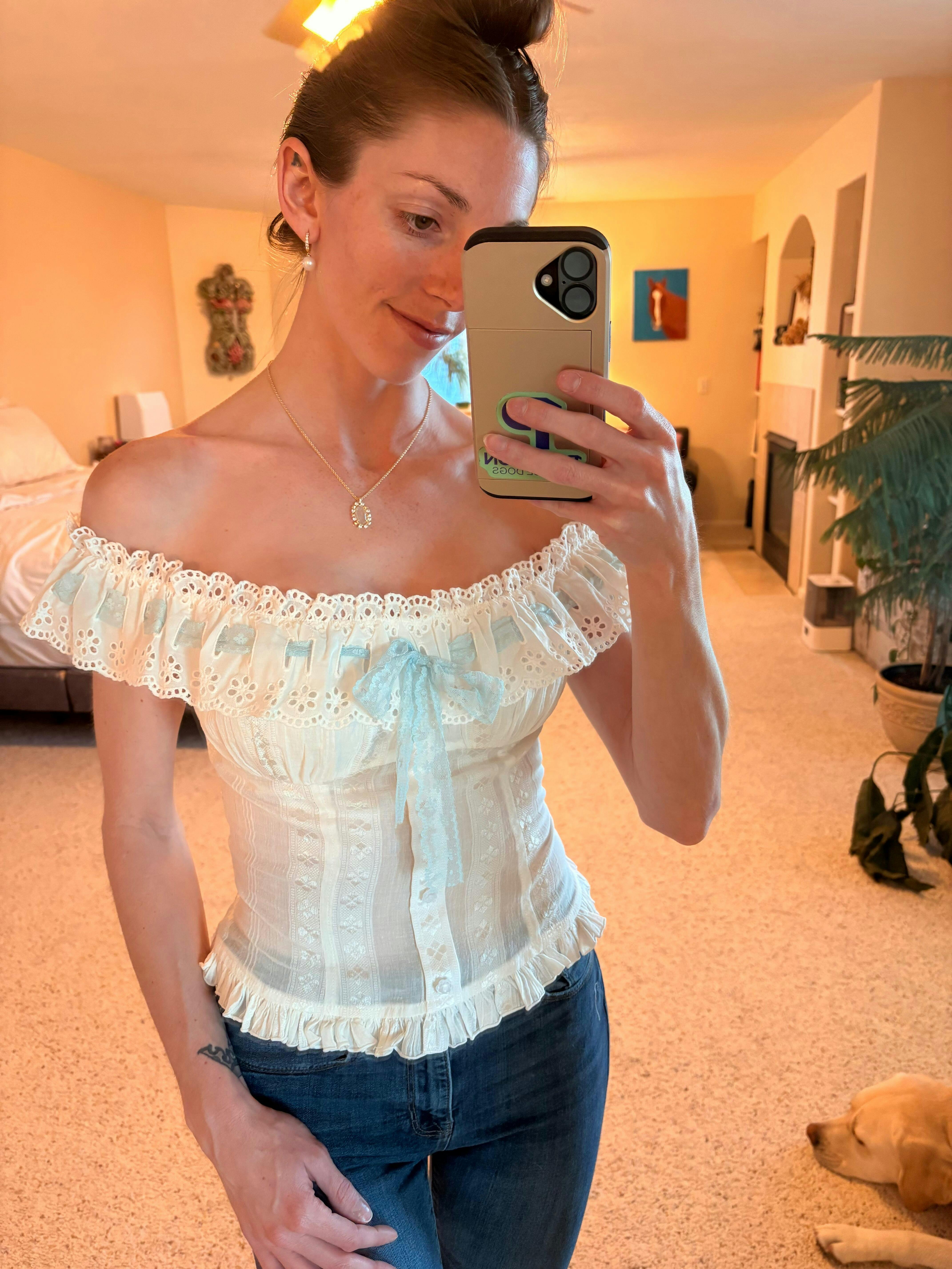 Even more beautiful in person! I’m 100lbs, 5’3 tall, 34 bust, 23 waist, 33 hips. I’m wearing Small but could have done XS. The waist tie lets you cinch it in for a snatched look (and on a waist as small as mine XS would have less fabric bunched). My bust fits and there is still stretch! The off shoulder sleeves have little “scrunchie sleeves” within them that are snug to your arm (but stretchy and comfy) to keep the shoulders perfectly in place. It comes with a white lace ribbon if you want to change the blue! The buttons down the front are shaped like flowers, and there is a very subtle floral print within the fabric. It is just gorgeous and I will be wearing it every day!!