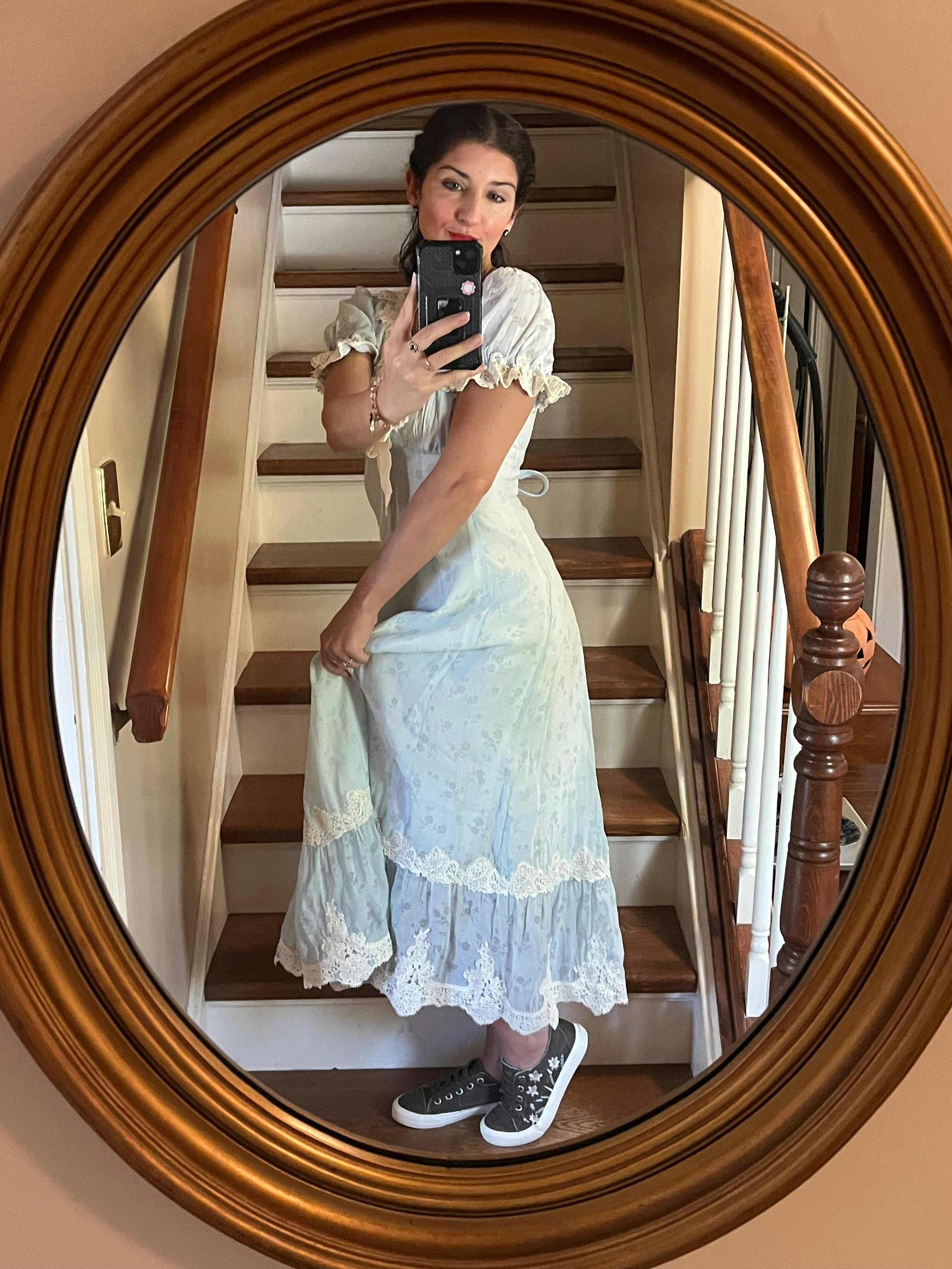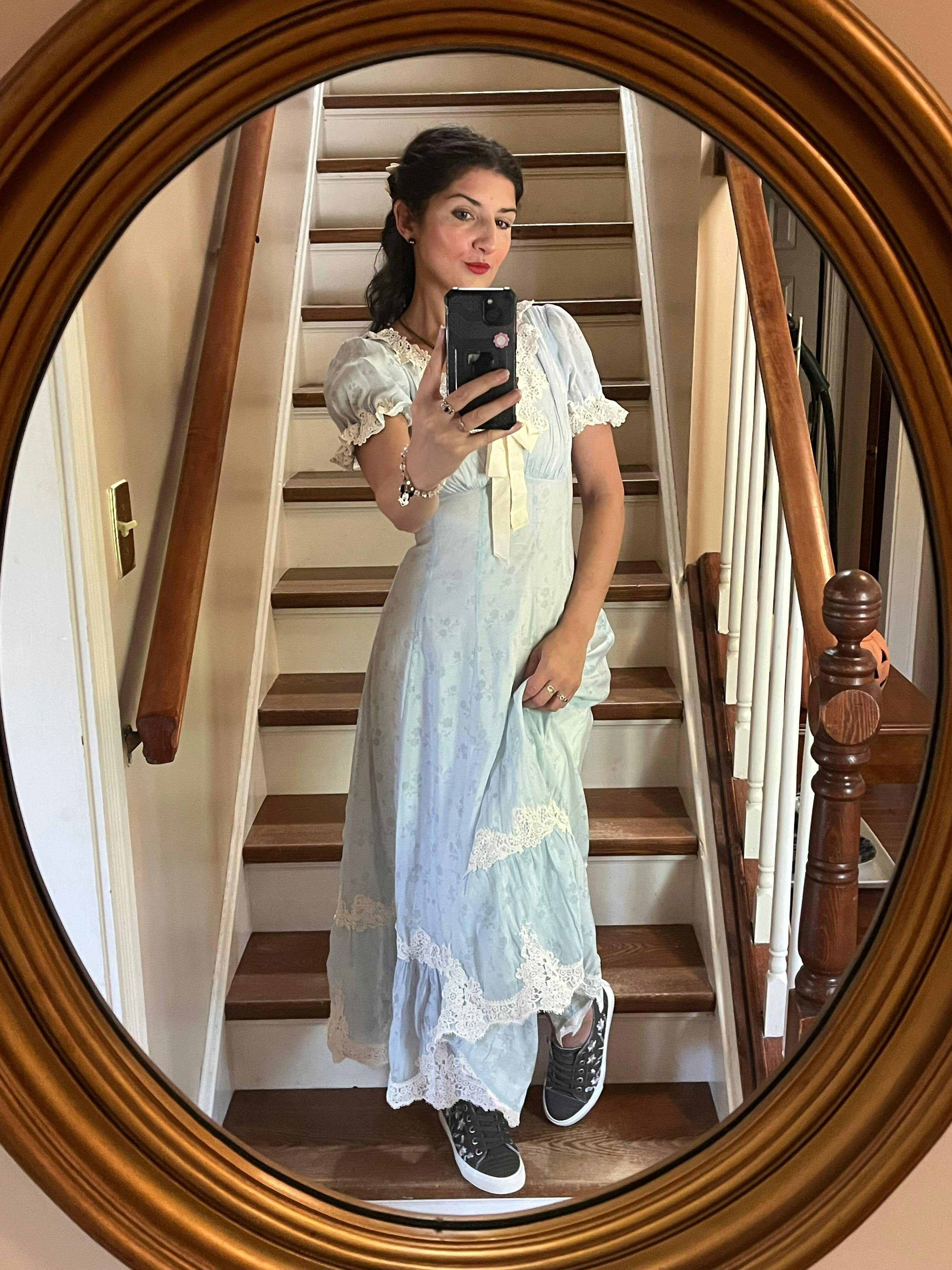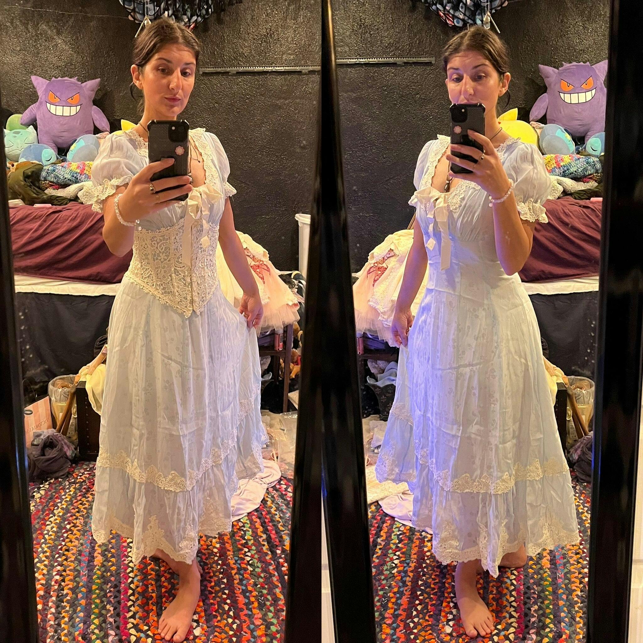 So, this is definitely in my top 3 LaceMade pieces! It makes me feel like Giselle from Enchanted! It’s darling with or without the corset, as the bow in the back adds plenty of accentuation at the waist! It’s comfortable enough for all-day wear, and I say that as someone with strong sensory issues, particularly with sleeves and bows in the back - my mom had to cut the ties off all my church dresses because I haaaaaaaate leaning on bows! This one is soft. Also, add a cute Sherpa vest or Bambi jacket to transition to colder weather!