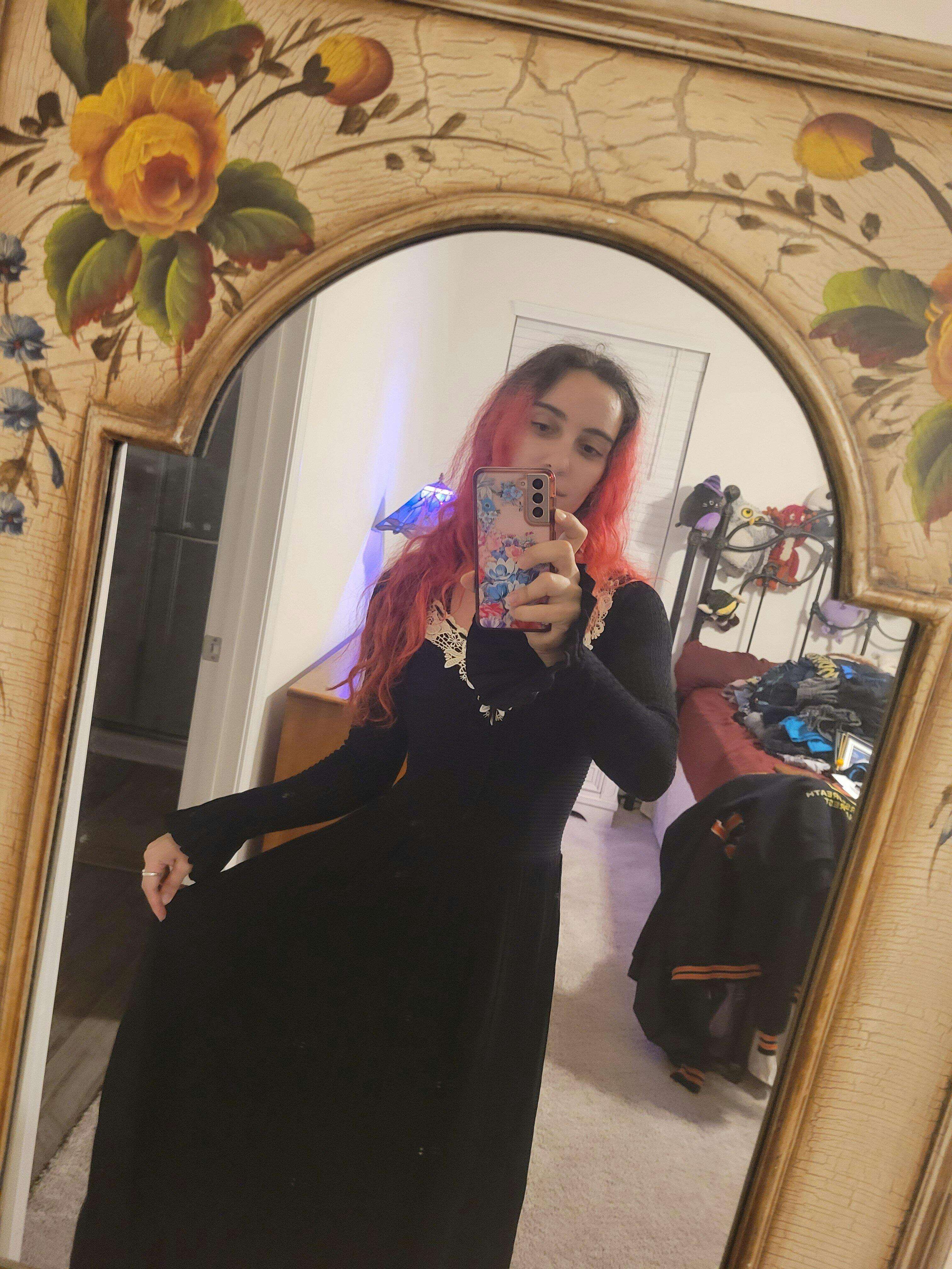 I am in love with it and was grateful for the rare black dress on Lacemade (I tend to stain lighter colors quickly). I hate wearing bras and this is modest without one and SO comfortable. I wear size 4 (128 lb, 35-27-35 inches) and could have sized down to small, but the medium is still perfect since it is so stretchy.