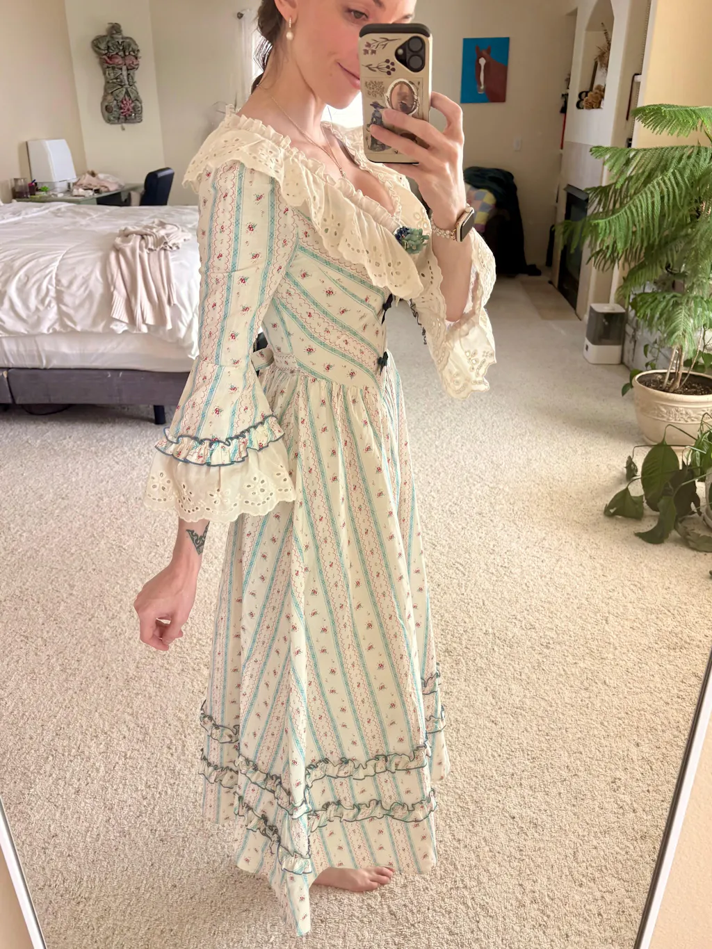 🧵Comments- In love with the sleeves & lace as expected lol. And it’s the perfect compromise between long sleeve and short! The center flower&bow is a removable pin and does look quite plasticky up close but is beautifully different from a normal distance. The print is really gorgeous and I love how the blue stripes have little x’s within it, like a plaid. Both the shell and lining is 100% cotton! I already wore it out for an appointment and got 4 different compliments in one small office building 🙈 Don’t miss out on this one!! 🤩🩵