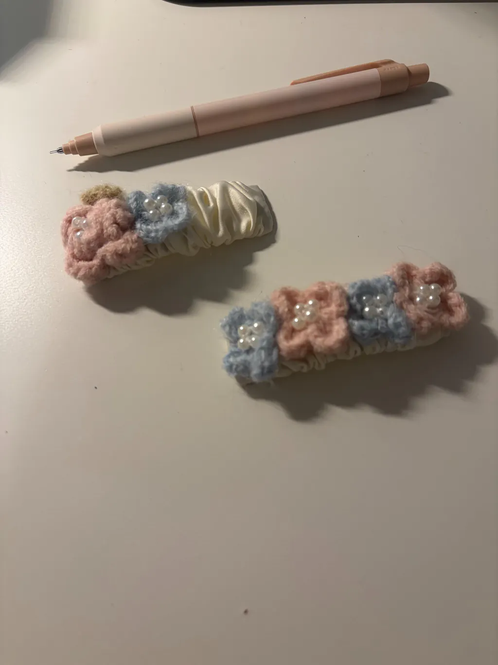 the hair clip has cute pearls stitched into the middle of the flowers. but it fell apart immediately when I took it out of the packaging. i sewed it back in.