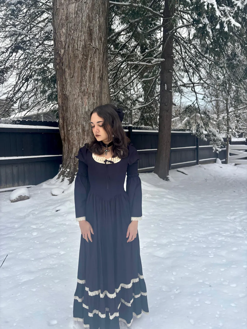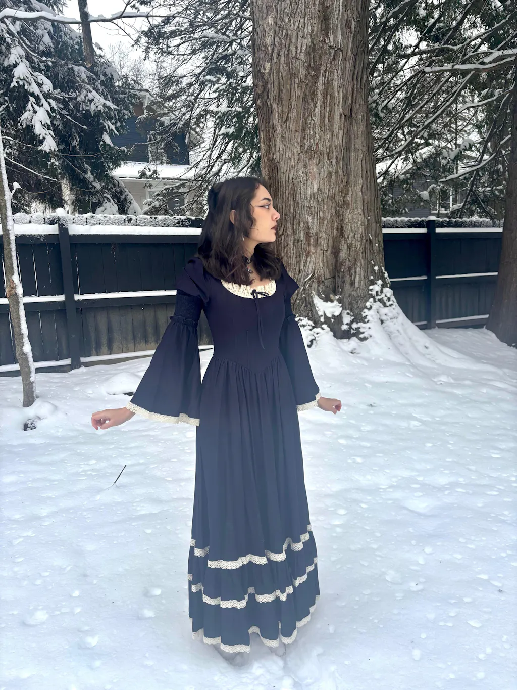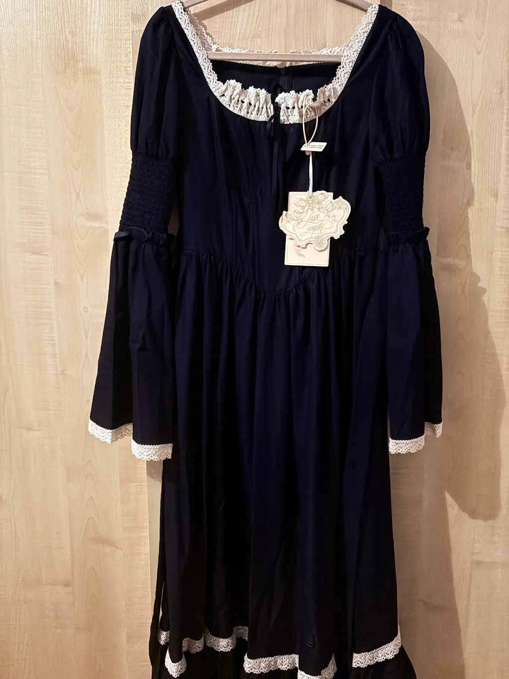 This dress is so much better in person! It’s a very dark navy and appears black in most lighting. It’s true to size and I love the sleeves, so gothic!